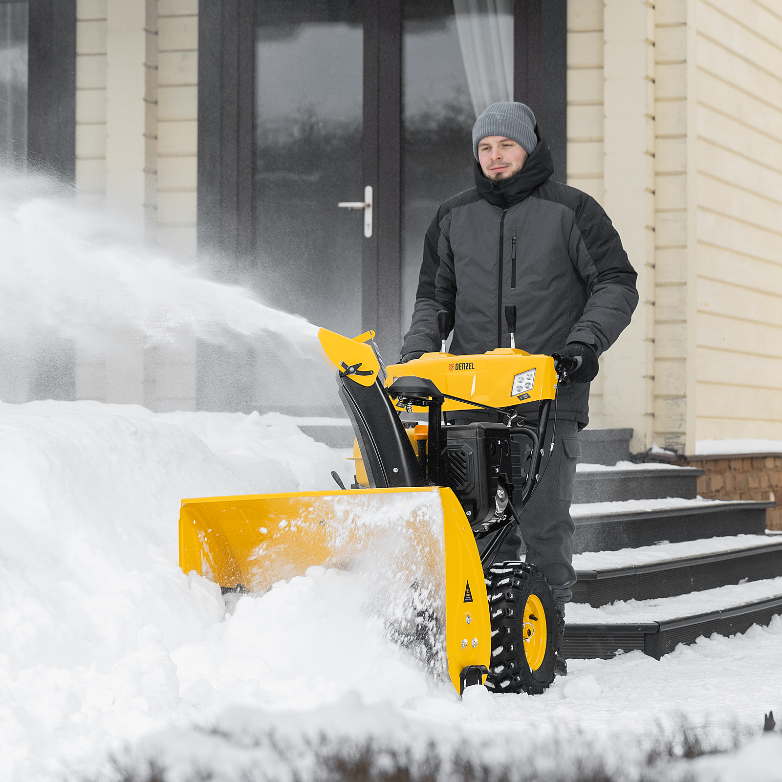 - Экономия сил и времени — снегоуборочная машина оснащена приводом на колеса, а значит, ее не придется толкать во время работы.