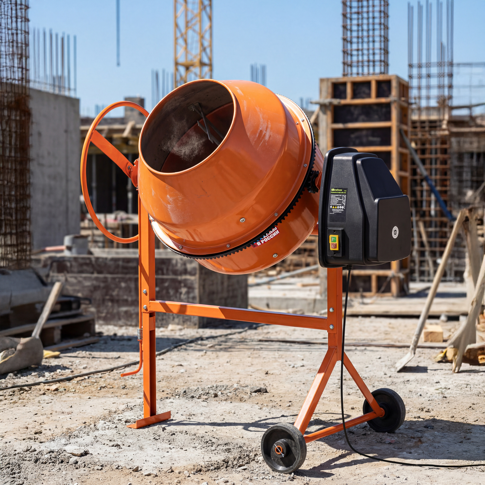 - Мобильность — прочные колеса облегчают перемещение бетоносмесителя по рабочей площадке.