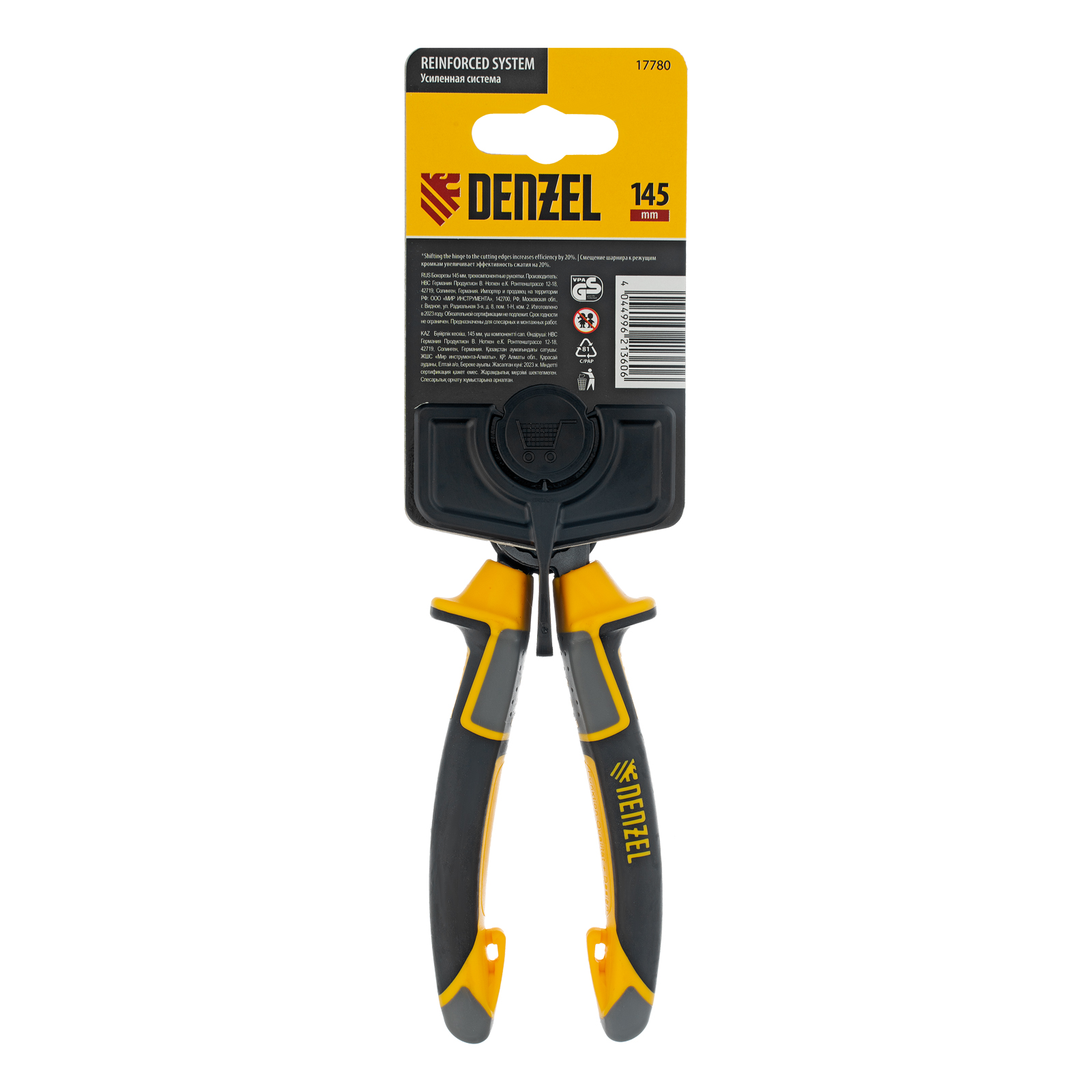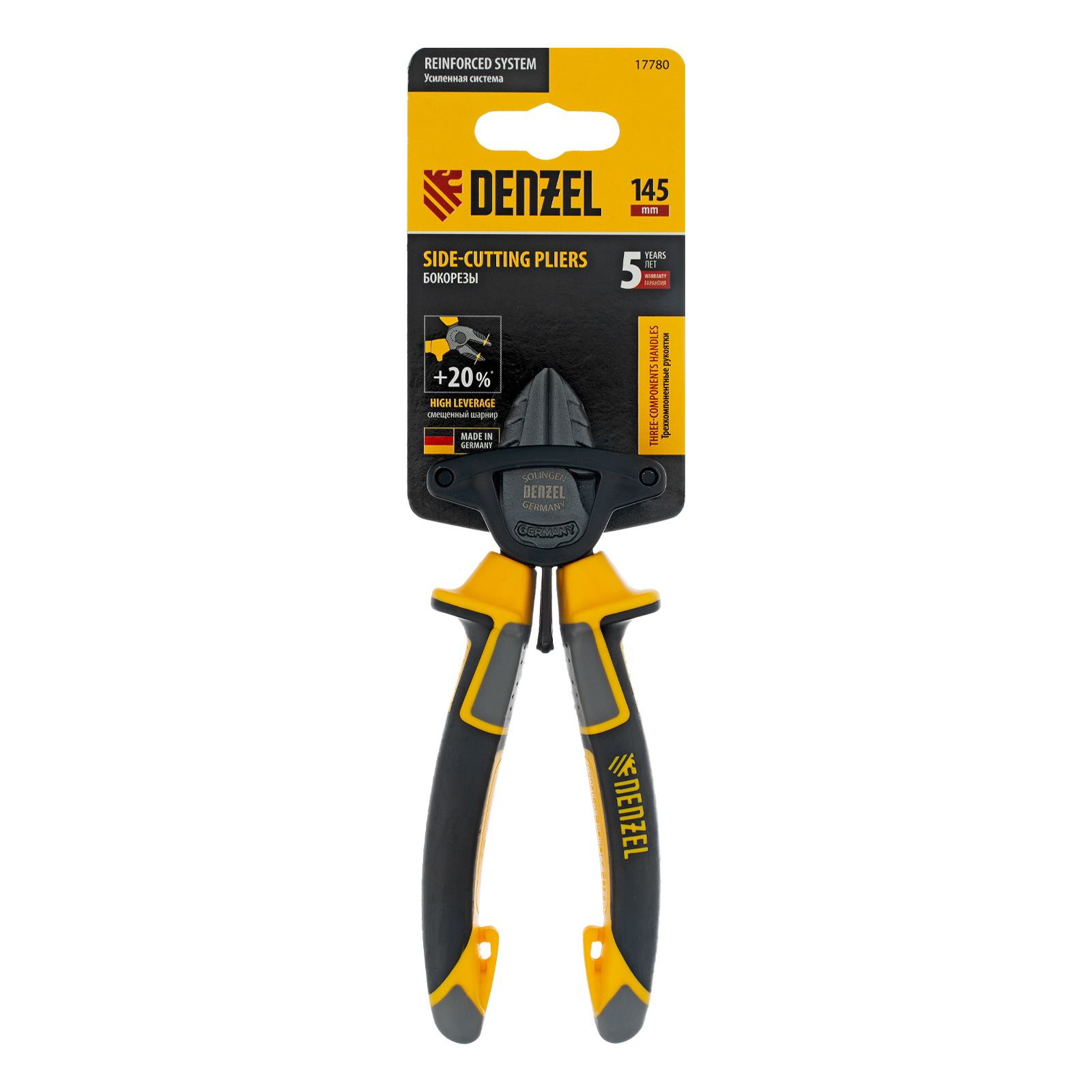 Бокорезы Denzel 17780 длиной 145 мм, с трехкомпонентными рукоятками, предназначены для разрезания кабелей из алюминия и меди, а также проволоки и стяжек. Максимальный диаметр перерезаемой мягкой проволоки (алюминиевой, медной, с пределом прочности 220 Н/мм2) составляет 5 мм, проволоки средней жесткости и гвоздей (750 Н/мм2) — 2,5 мм, жесткой (1800 Н/мм2) — 1,7 мм. Бокорезы используются для проведения слесарных и монтажных работ. Шарнир смещен к режущим кромкам, что позволяет сэкономить 20% усилий и максимально эффективно решать поставленные задачи.