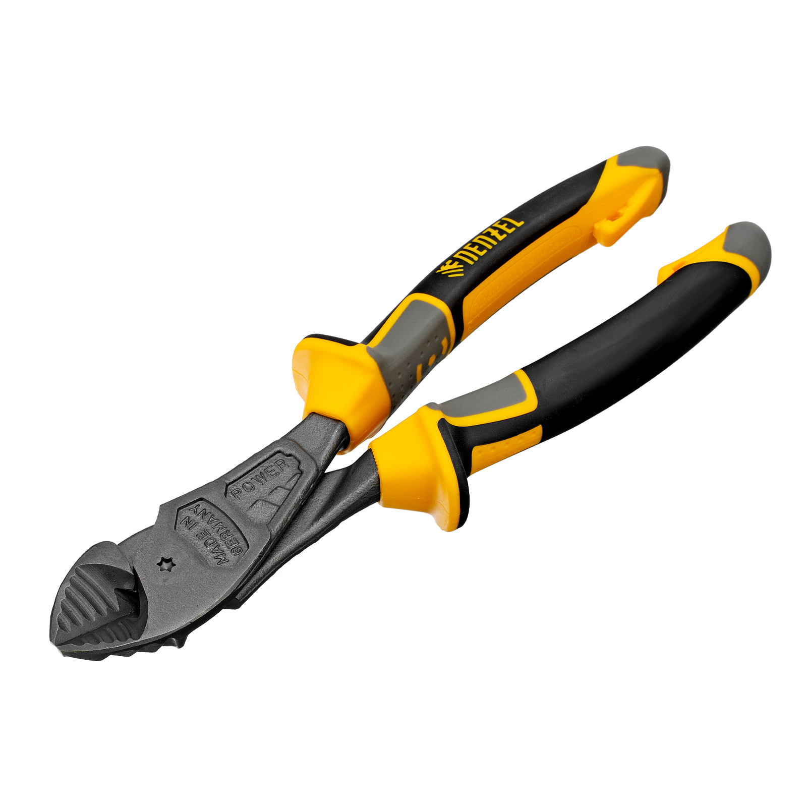 Усиленные бокорезы Denzel 17583 длиной 180 мм, с трехкомпонентными рукоятками, предназначены для разрезания кабелей, проводов, гвоздей и проволоки средней (750 Н/мм2) и высокой жесткости (1800 Н/мм2) диаметром 3,7 и 2,6 мм соответственно. Подходят для резки рояльных струн (предел прочности 2300 Н/мм2) диаметром до 2,2 мм. Успешно справляются не только с медными, алюминиевыми и пластмассовыми деталями, но и с более жесткими стальными элементами. Встроенный рычажный механизм и смещенный непосредственно к режущим кромкам шарнир увеличивают усилие реза на 20%.