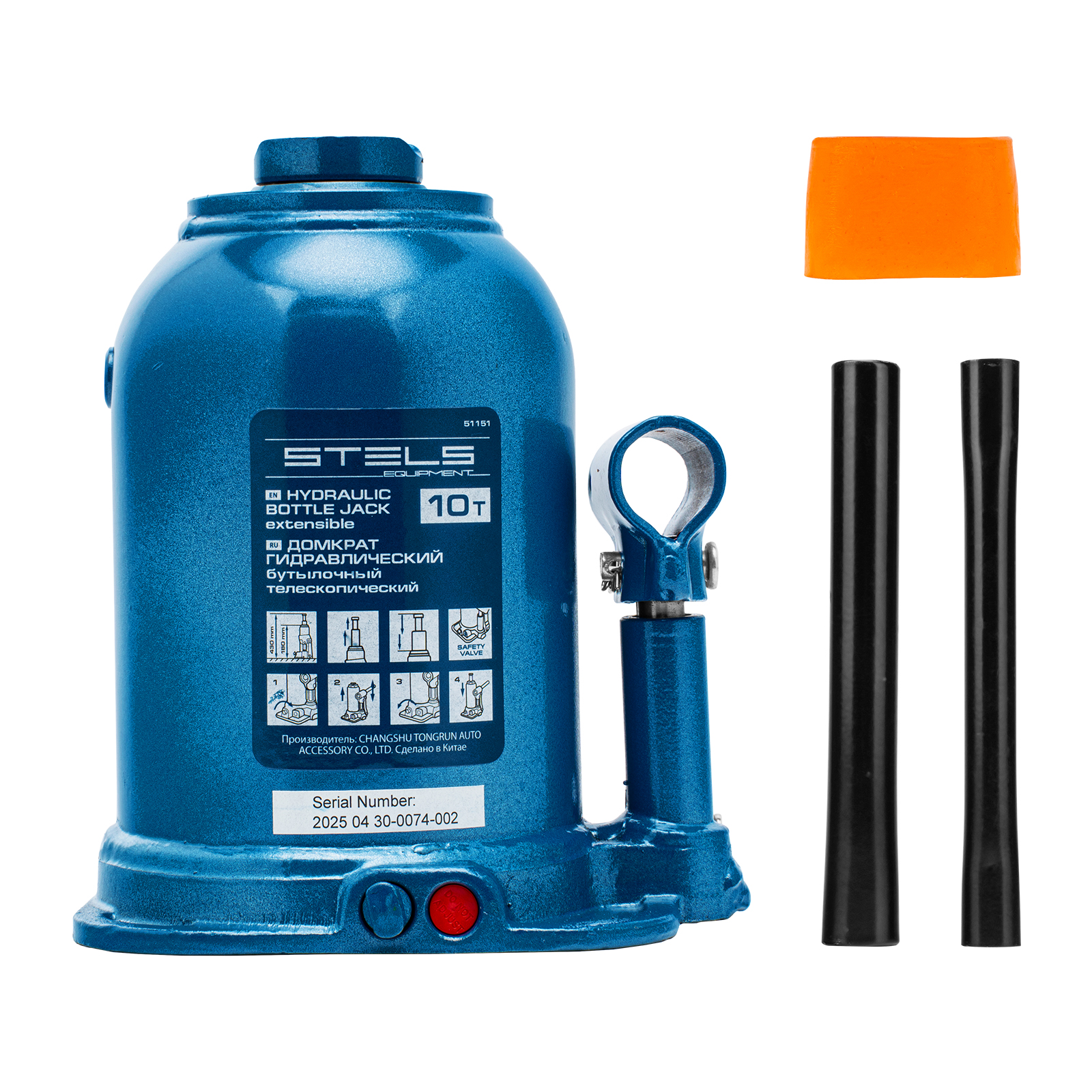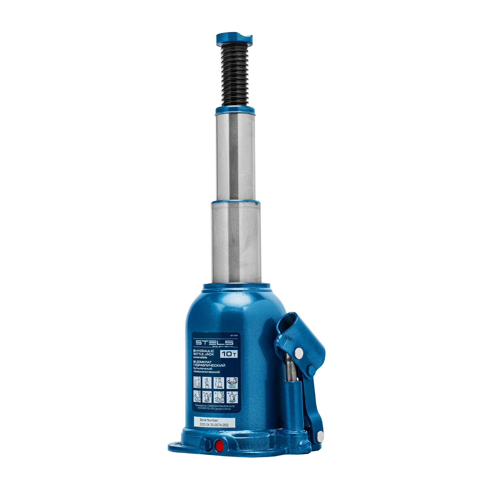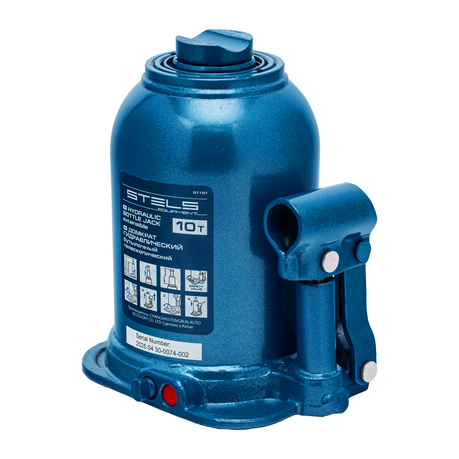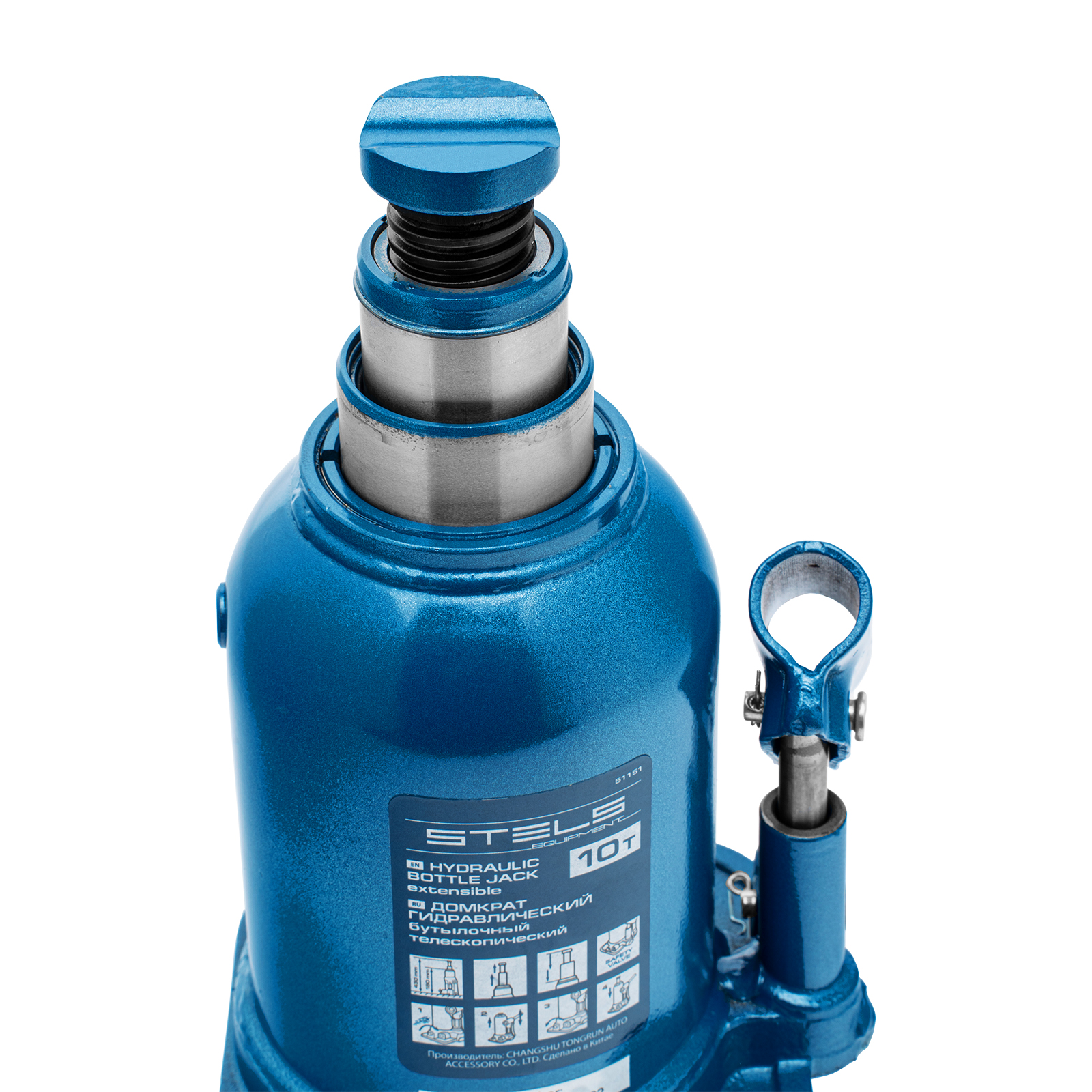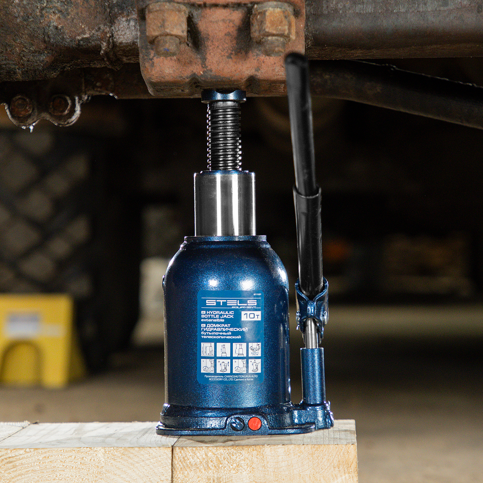 Домкрат гидравлический бутылочный Stels 51151, телескопический, используется для поднятия грузов весом до 10 т с на высоту 180-430 мм. Не требует больших усилий и оптимален для автомобилей с большим клиренсом. Домкрат можно использовать в гараже для самостоятельного ремонта машины или в автосервисе для решения профессиональных задач.