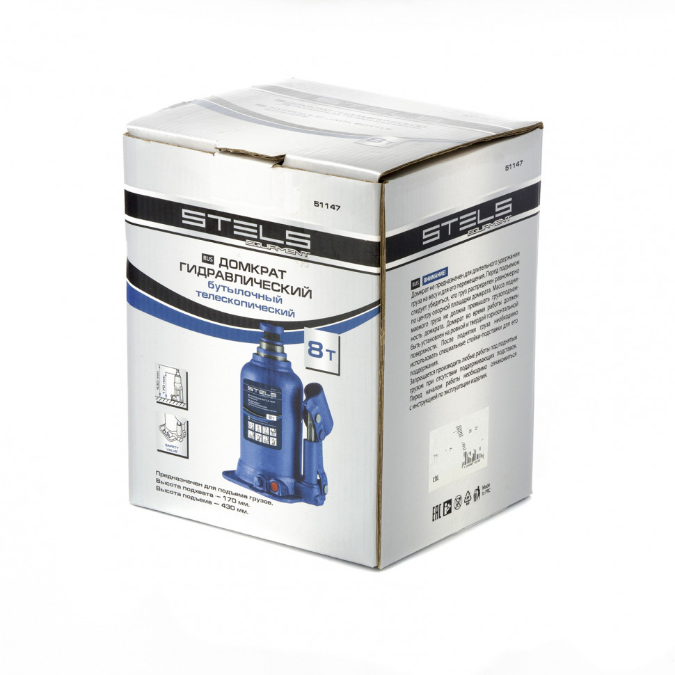 Гидравлический бутылочный телескопический домкрат Stels 51147 используется для поднятия грузов весом до 8 т с на высоту 170-430 мм. Не требует больших усилий и оптимален для автомобилей с большим клиренсом. Домкрат можно использовать в гараже для самостоятельного ремонта машины или в автосервисе для решения профессиональных задач.