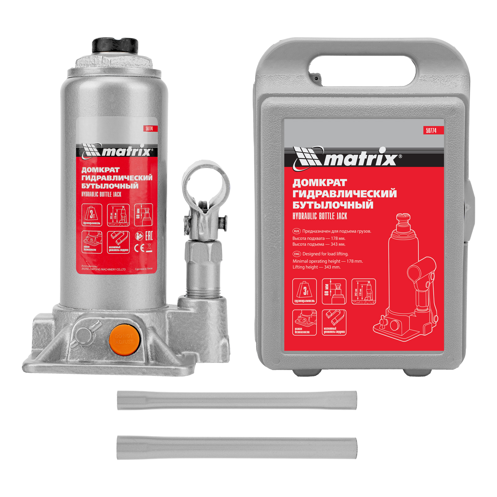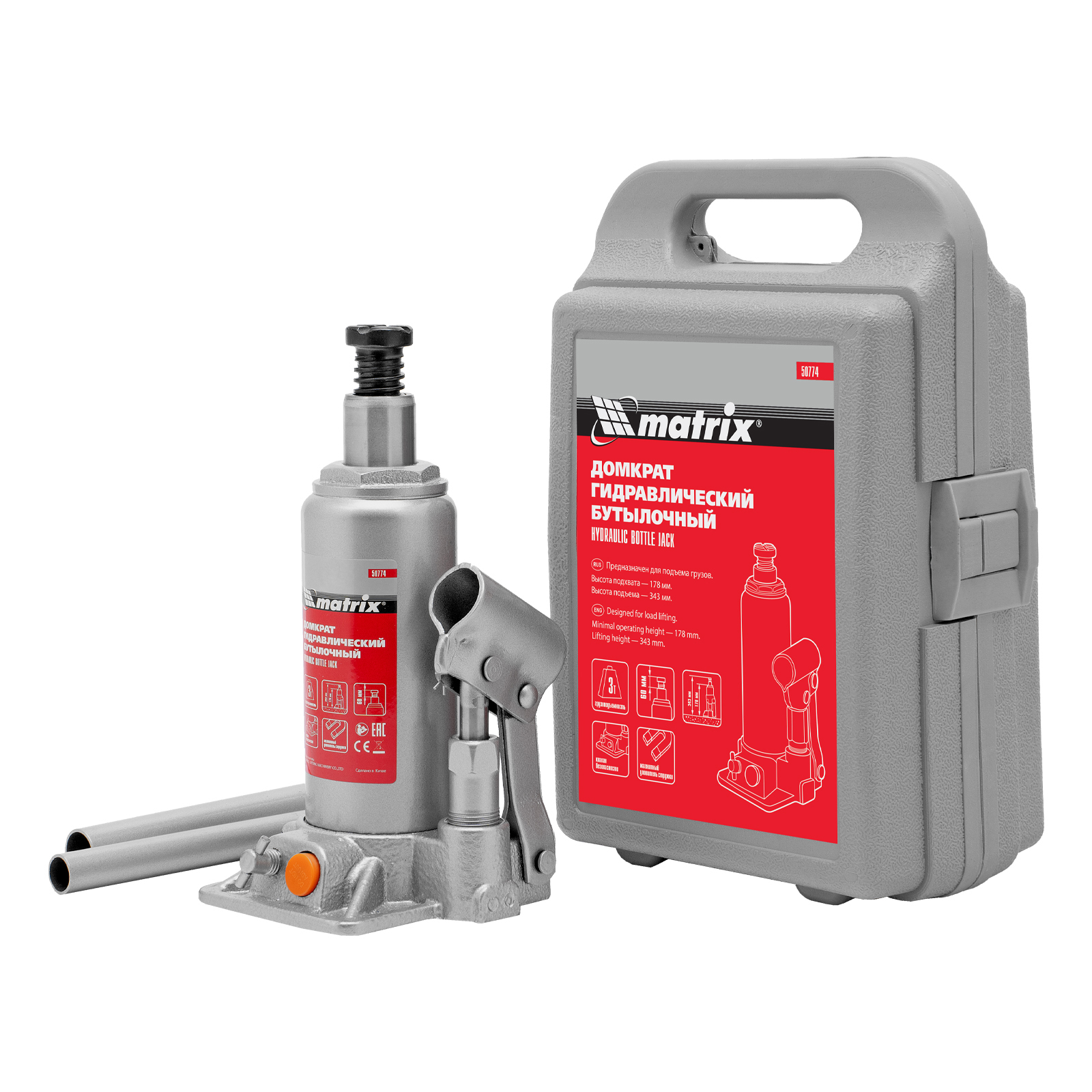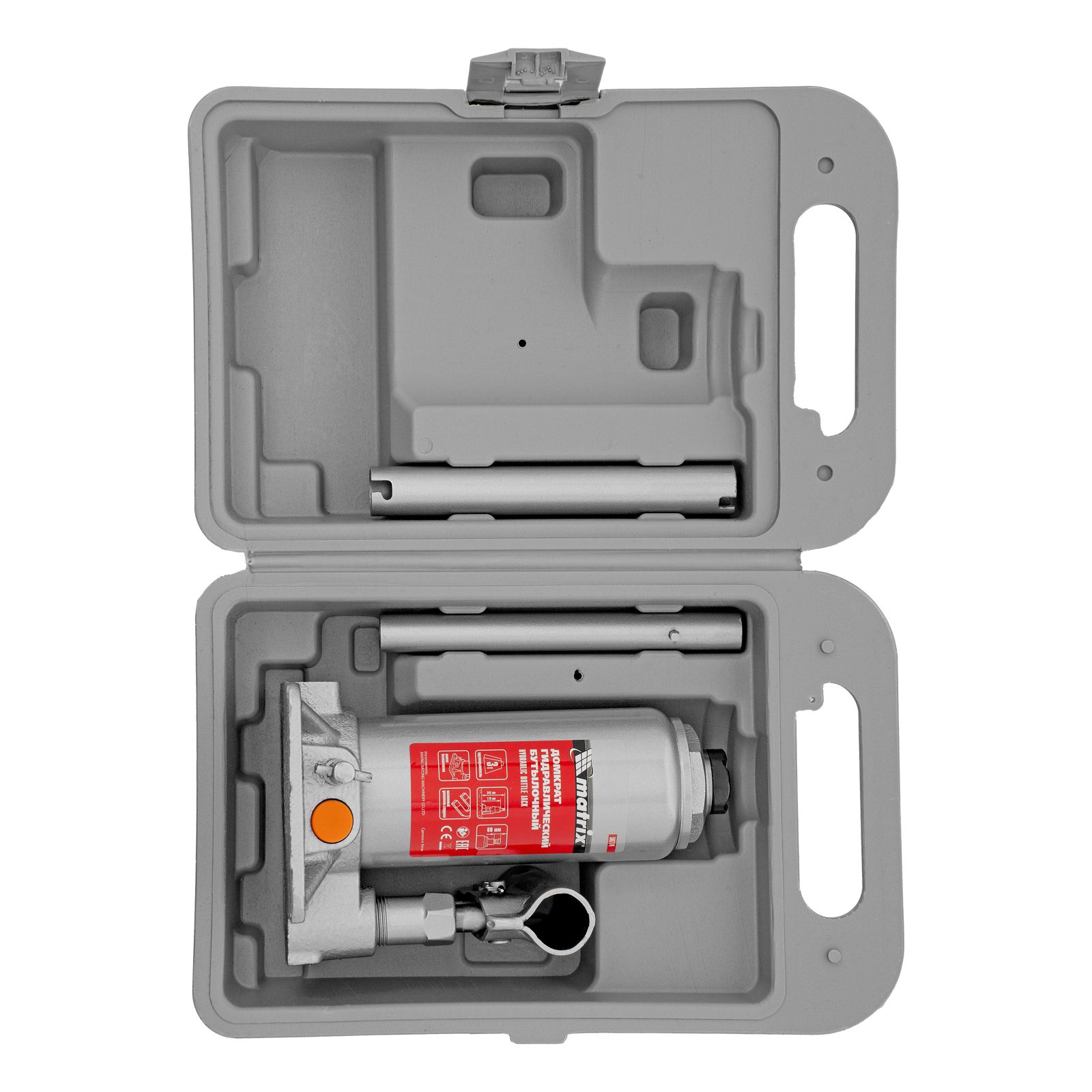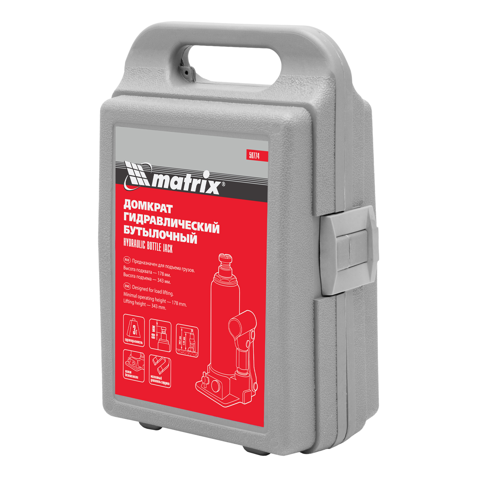 Домкрат гидравлический бутылочный, 3 т, h подъема 178-343 мм, в пластиковом кейсе Matrix в Челябинске