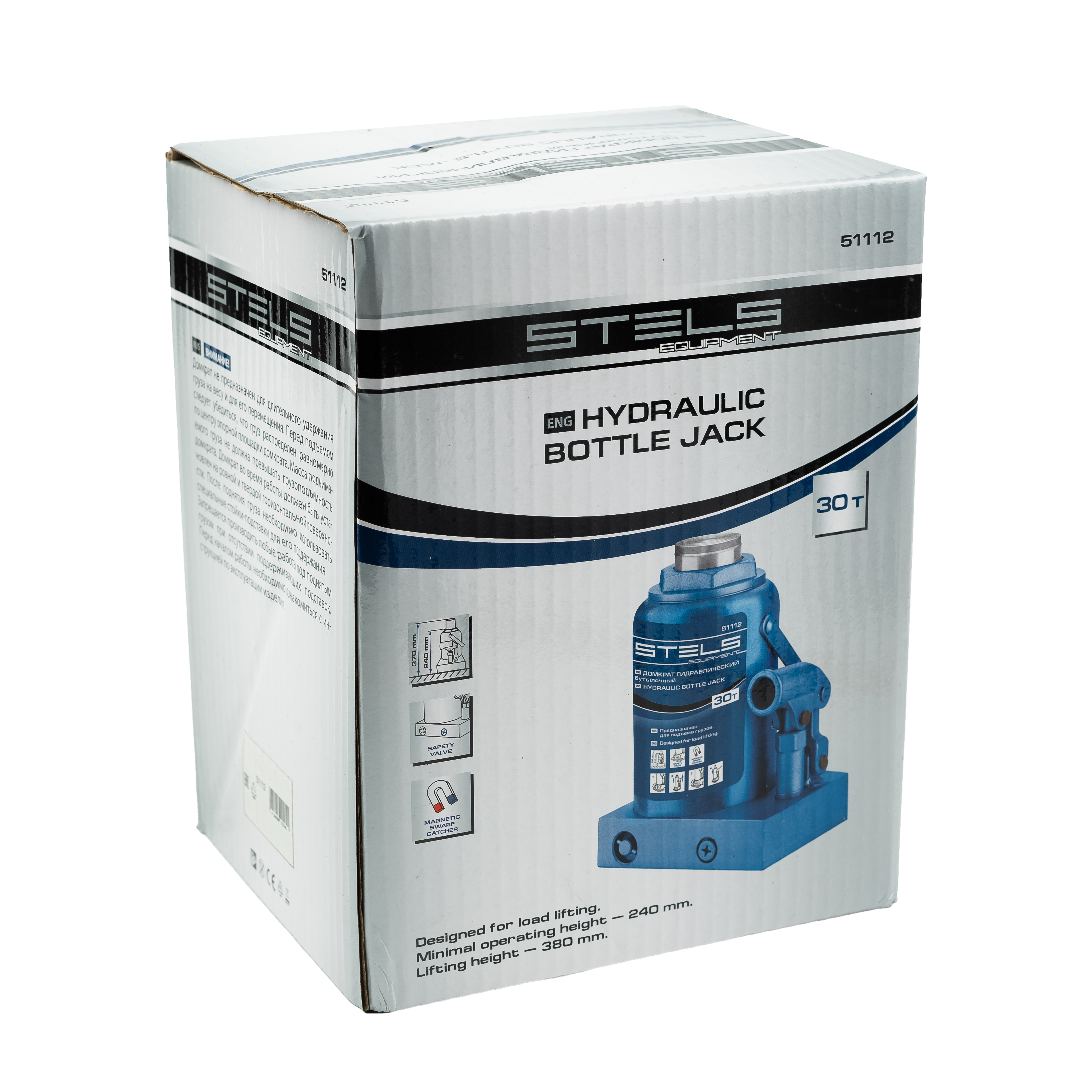 Гидравлический бутылочный домкрат Stels 51112 способен поднимать грузы массой до 30 т на высоту с 244 до 370 мм. Устанавливается на ровной твердой горизонтальной поверхности и позволяет разместить под грузом жесткую опору перед выполнением дальнейших работ. Используется на предприятиях автосервиса, применяется во время ремонта и строительства.