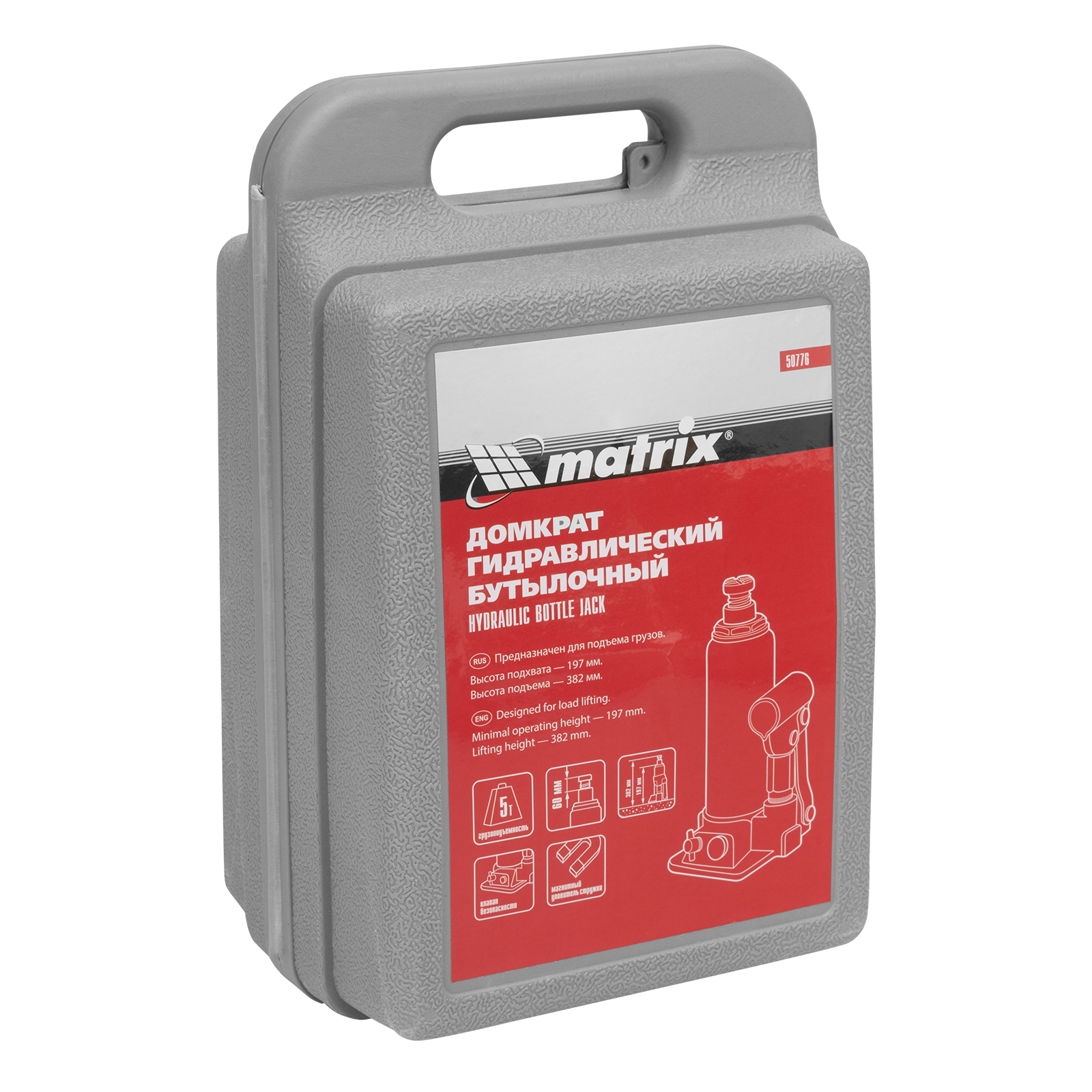 Домкрат гидравлический бутылочный, 5 т, h подъема 197-382 мм, в пластиковом кейсе Matrix в Челябинске