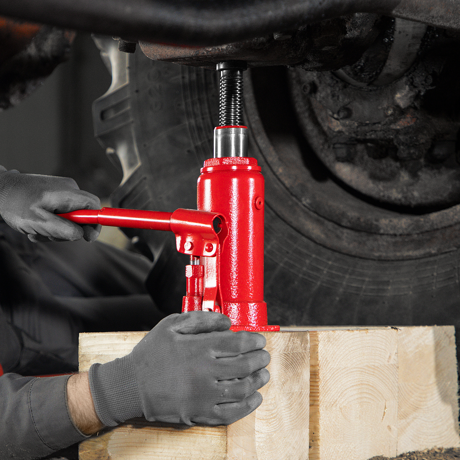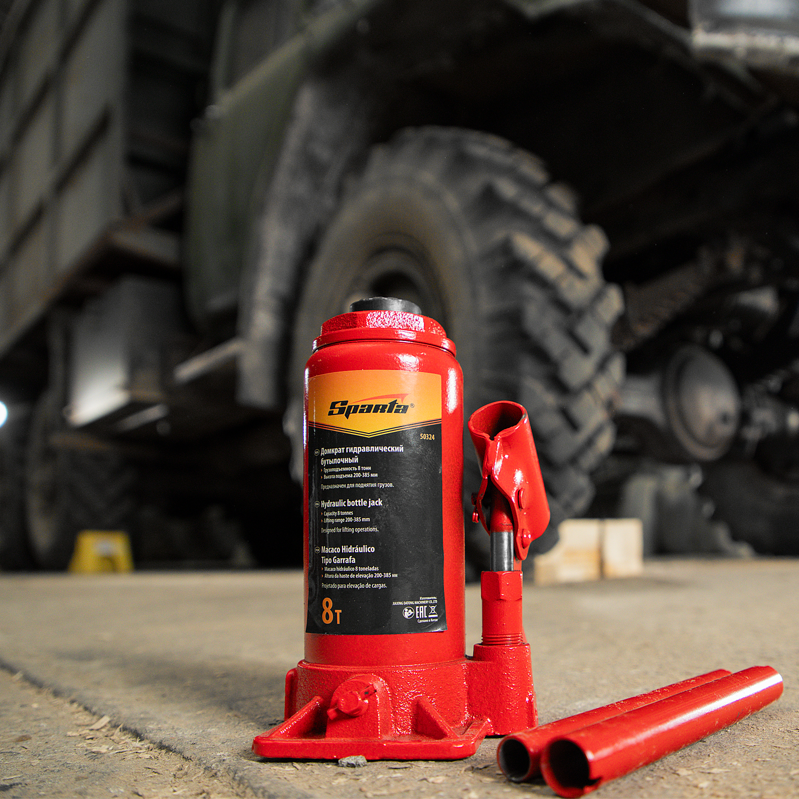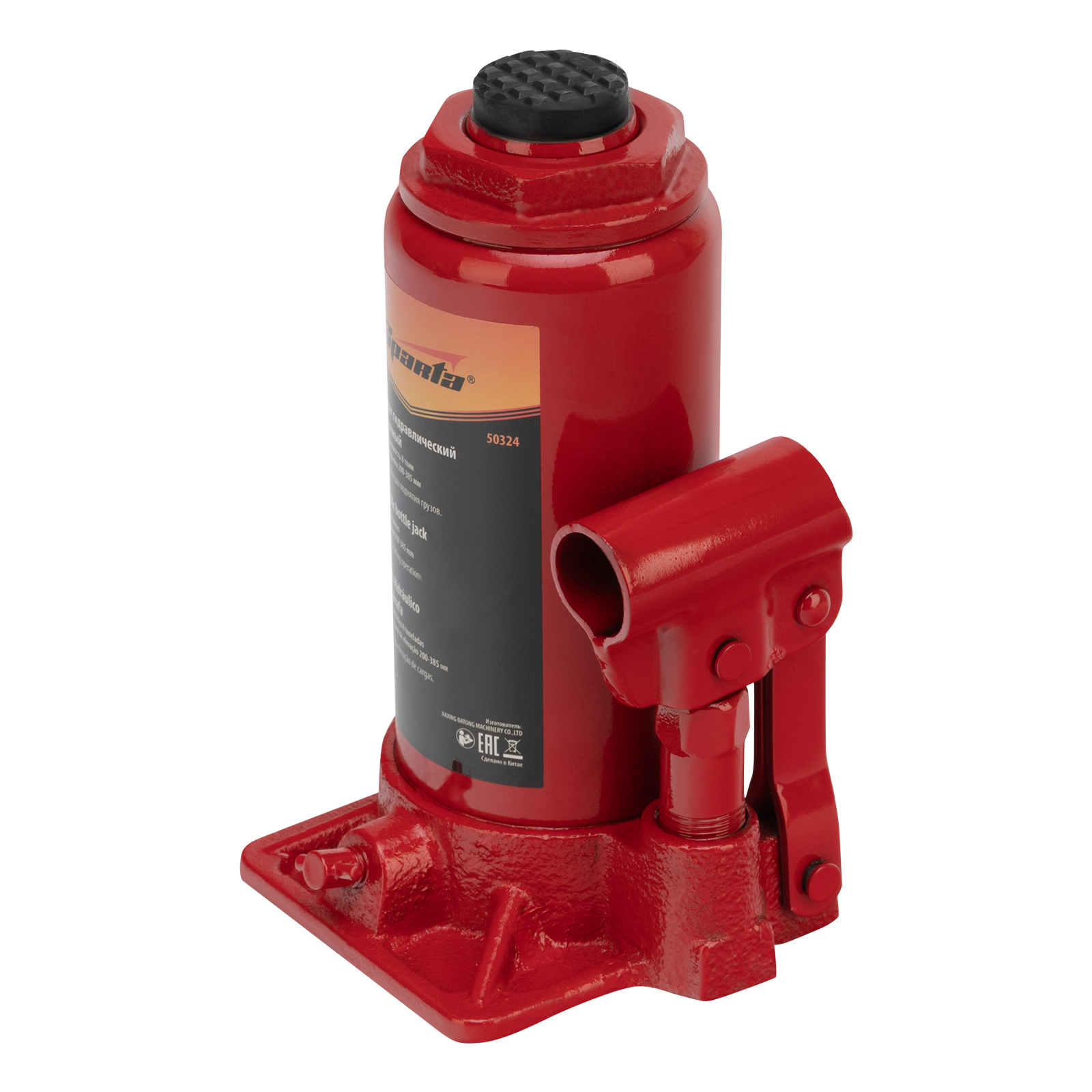Гидравлический бутылочный домкрат Sparta 50324 рассчитан на подъем грузов весом до 8 т на высоту от 200 до 385 мм. Он пригодится как автолюбителям в гараже, так и профессиональным мастерам в автосервисах. Домкрат обеспечивает плавный подъем груза без особых усилий со стороны пользователя.