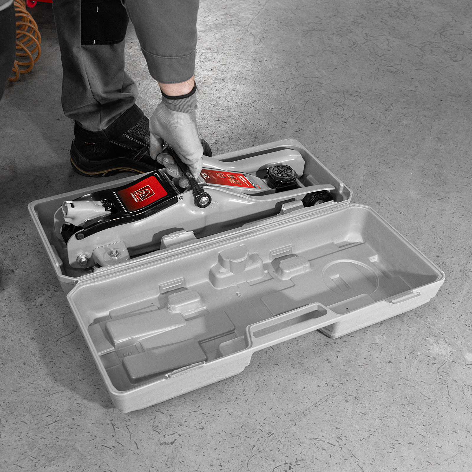 - Удобное хранение и транспортировка — домкрат поставляется в пластиковом кейсе.