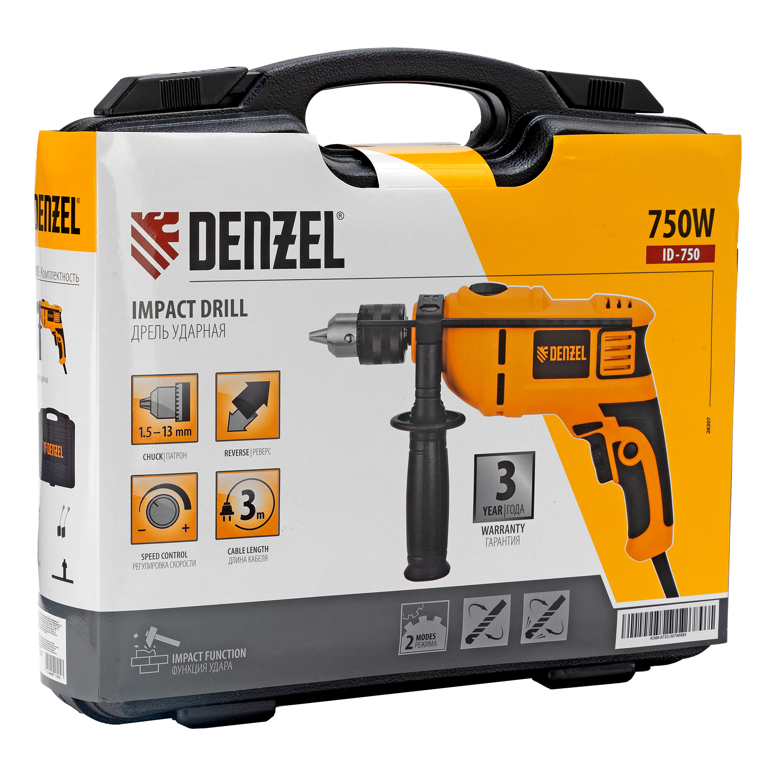 Дрель ударная ID-750, 750 Вт, 0-3000 об/мин, 48000 уд/мин Denzel в Челябинске