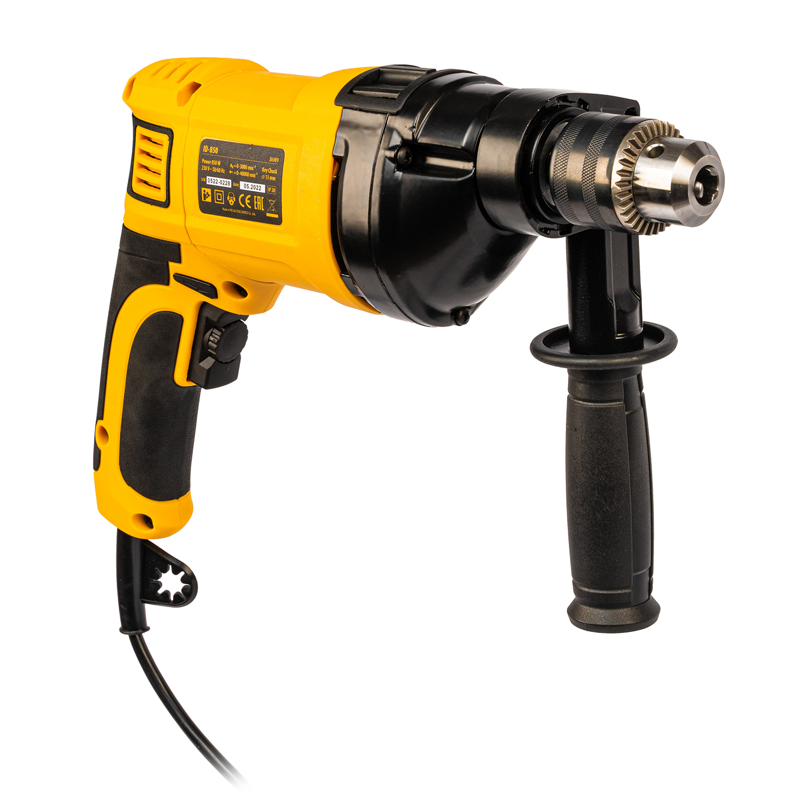 Ударная дрель Denzel ID-850 26309 мощностью 850 Вт поддерживает скорость вращения оснастки 0-3000 об/мин и частоту ударов 48000 уд/мин. Используется для ручного или ударного сверления металла, древесины, легкого бетона, кирпича, плитки или пластика. Сверлит отверстия диаметром до 25 мм в древесине, до 13 мм в бетоне и до 13 мм в металле. Эффективное сверление твердых материалов обеспечивает массивный промщит ударного механизма. Дрель работает со сверлами с диаметром хвостовика 1,5-13 мм, что позволяет эффективно решать различные задачи.