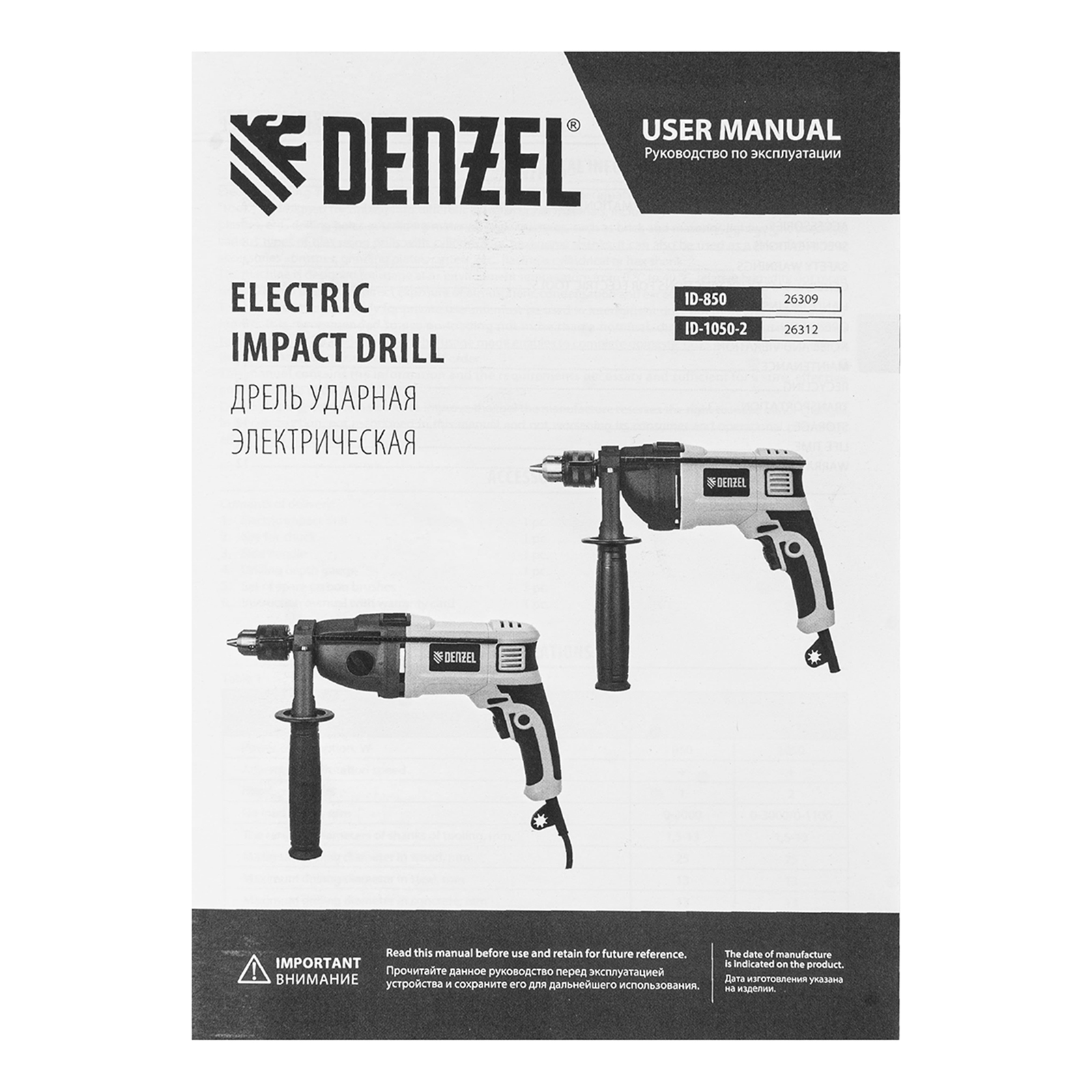 Дрель электрическая ударная - 1 штКлюч от патрона - 1 штРукоятка боковая - 1 штОграничитель глубины сверления - 1 штКомплект запасных угольных щеток - 1 штРуководство по эксплуатации с гарантийным талоном - 1 шт |