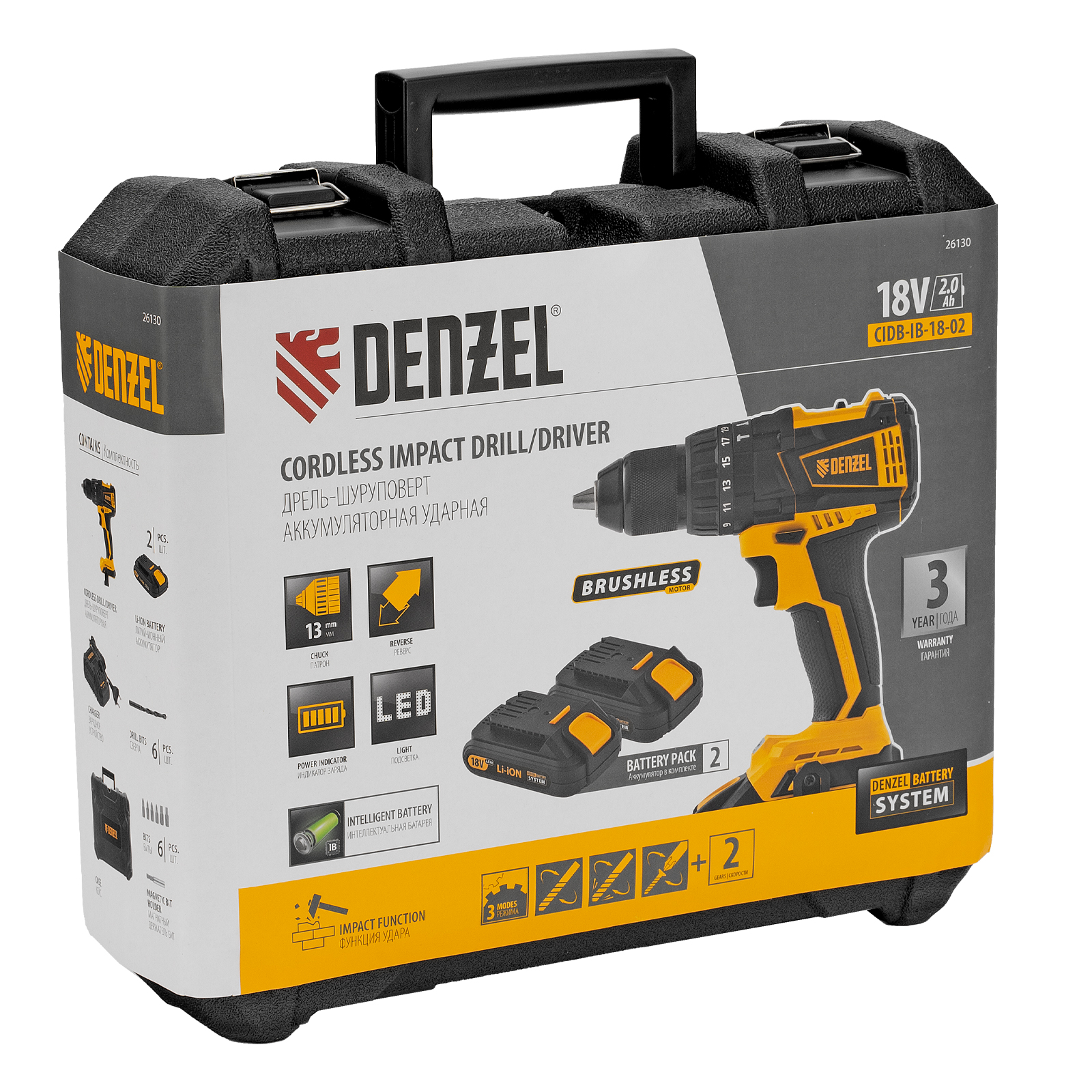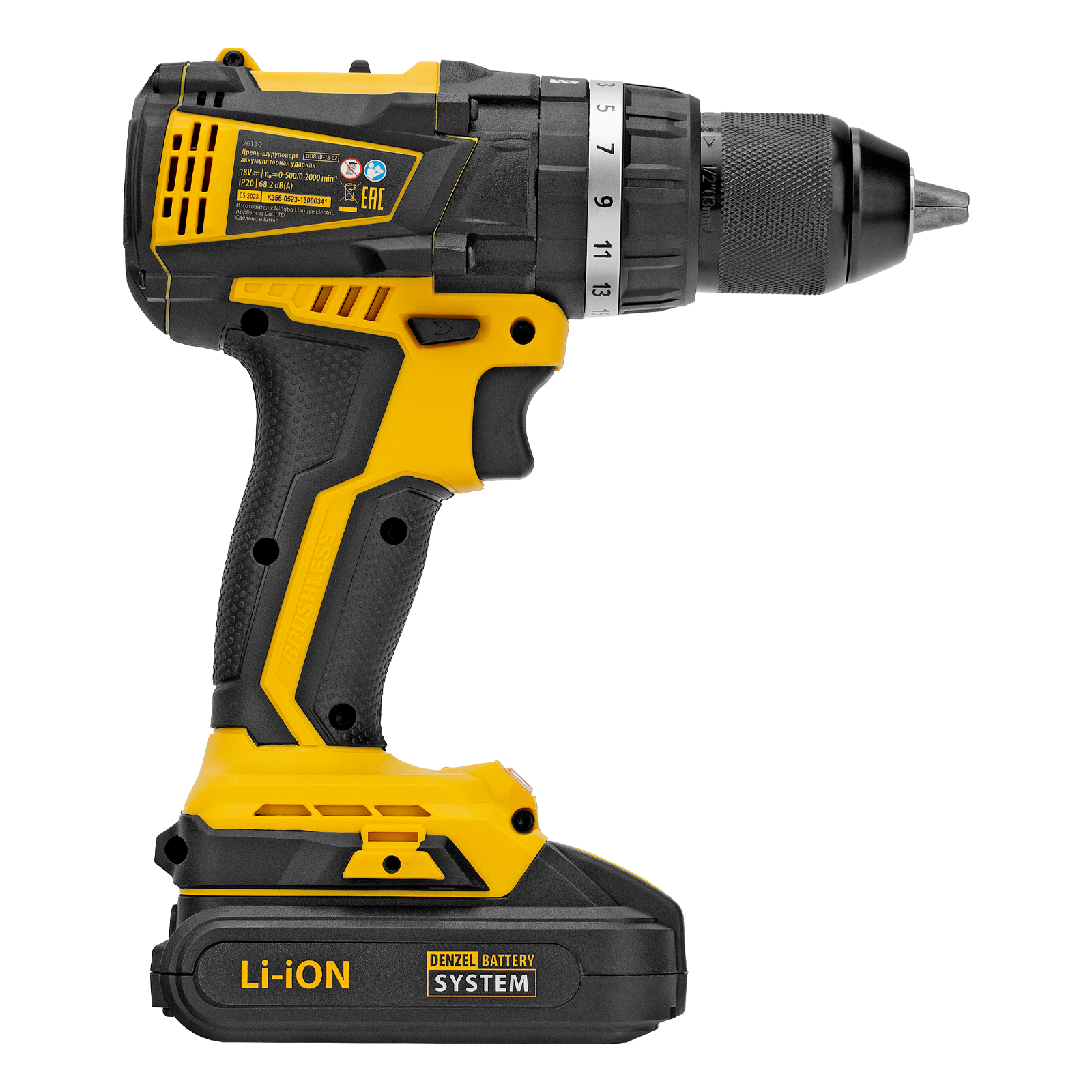 Дрель-шуруповерт аккумуляторная ударная бесщет CIDB-IB-18-02, Li-Ion, 18 В, 2 акк. Denzel в Челябинске