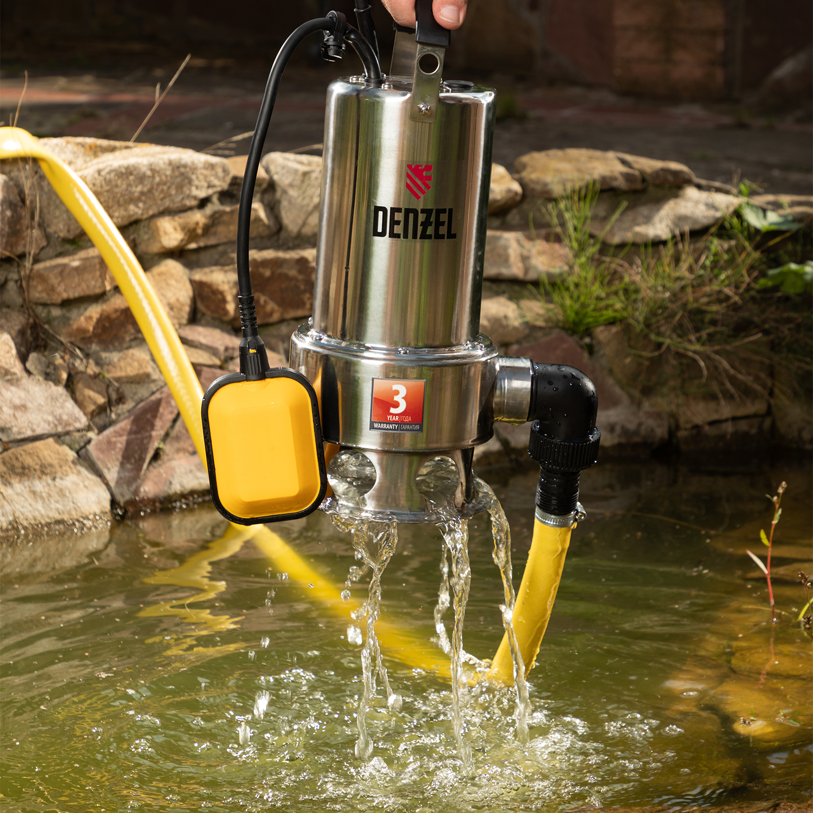 - Автономная работа — поплавковый выключатель останавливает двигатель при падении уровня воды ниже допустимого, исключая работу на сухом ходу.