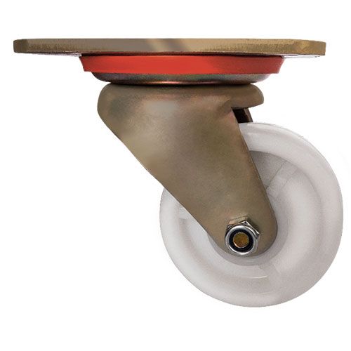 Данное большегрузное нейлоновое колесо предназначено для установки на передвижное оборудование, используемое в пищевой, химической и фармацевтической промышленности. Оно не боится воздействия влаги и различных химически агрессивных веществ, отличается низким коэффициентом трения и высокой износостойкостью. Шариковый подшипник в оси обеспечивает плавное вращение. Поворотный кронштейн изготовлен из оцинкованной стали, тип крепления — платформа с отверстиями под болты. Максимальная грузоподъемность модели — 550 кг.