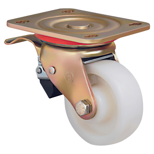 Большегрузное колесо ED01HKZ150F бренда EMES изготовлено из нейлона, устойчиво к воздействию различных агрессивных химических веществ. Подходит для эксплуатации в условиях, требующих соблюдения высоких санитарно-гигиенических требований — например, на предприятиях пищевой промышленности, в лабораториях и медицинских учреждениях. Кронштейн у модели поворотный, изготовлен из оцинкованной стали. Наличие тормозного механизма позволяет при необходимости надежно блокировать колесо, предотвращая его самопроизвольное перемещение.