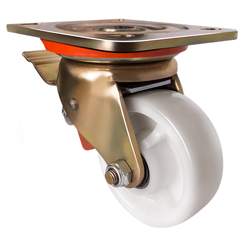 Данное большегрузное нейлоновое колесо предназначено для установки на передвижное оборудование, используемое в пищевой, химической и фармацевтической промышленности. Оно не боится воздействия влаги и различных химически агрессивных веществ, отличается низким коэффициентом трения и высокой износостойкостью. Шариковый подшипник в оси обеспечивает плавное вращение. Поворотный кронштейн изготовлен из оцинкованной стали, тип крепления — платформа с отверстиями под болты. Наличие тормозного механизма позволяет при необходимости надежно блокировать колесо, предотвращая его самопроизвольное перемещение. Максимальная грузоподъемность модели — 750 кг.