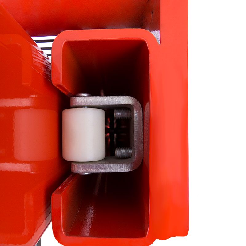 Наличие цепной связи между ручкой управления и поворотным колесом увеличивает маневренность. Также на штабелере установлены защитные кожухи на колесах, предотвращающие возможность наезда на ноги, решетчатый экран мачты, стояночный тормоз и прорезиненное покрытие на рукоятке управления, исключающее скольжение рук.