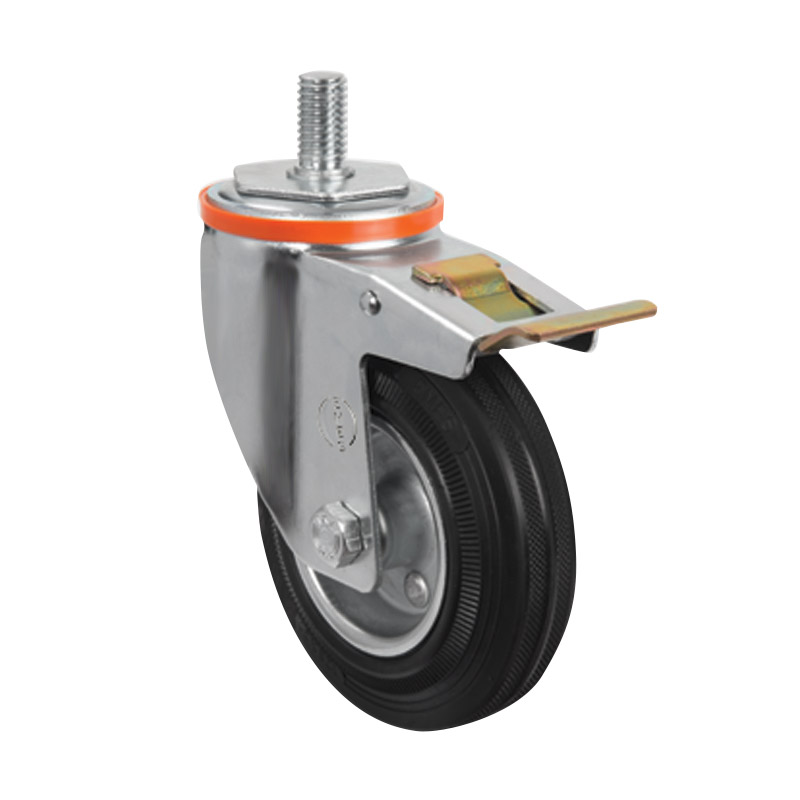 Грузоподъемность данного промышленного колеса составляет 110 кг, диаметр — 125 мм. Контактный слой изготовлен из литой черной резины, обод и кронштейн — из оцинкованной стали. Роликовый подшипник в оси обладает высокой стойкостью к радиальным нагрузкам. Модель подходит для установки на различное складское и строительное оборудование, контейнеры ТБО, может использоваться на поверхностях с уклонами и неровностями, во влажной среде.