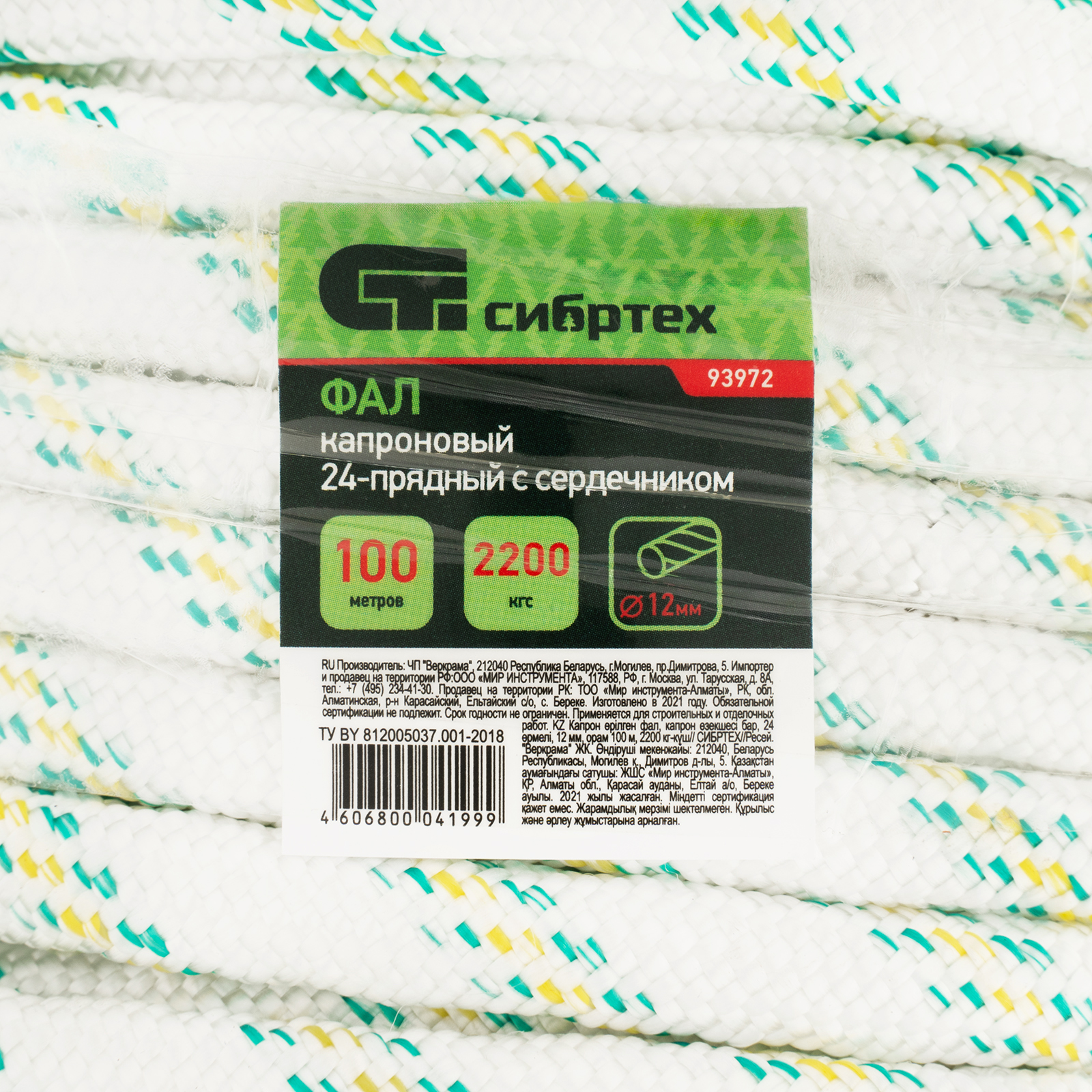 Плетеный капроновый фал Сибртех 93972 с сердечником, 24-прядный, длиной 100 м и диаметром 12 мм, используется для подъема и закрепления грузов, установки различных конструкций. Востребован в сельском хозяйстве, строительстве, нефтяной промышленности, на транспорте, в спорте, рыболовстве. Также применяется в ходе спасательных работ. Шнур имеет полиамидный сердечник, обладает высокой упругостью и выдерживает разрывную нагрузку 2200 кгс.