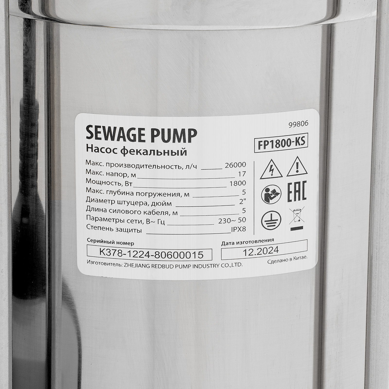 Фекальный насос FP1800-KS, 1800 Вт, напор 17 м, 26000 л/ч, нож-измельчитель Denzel в Челябинске
