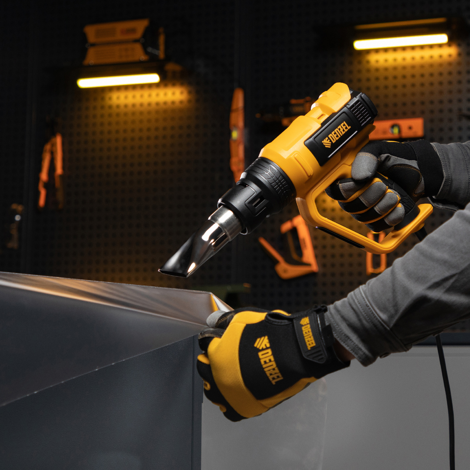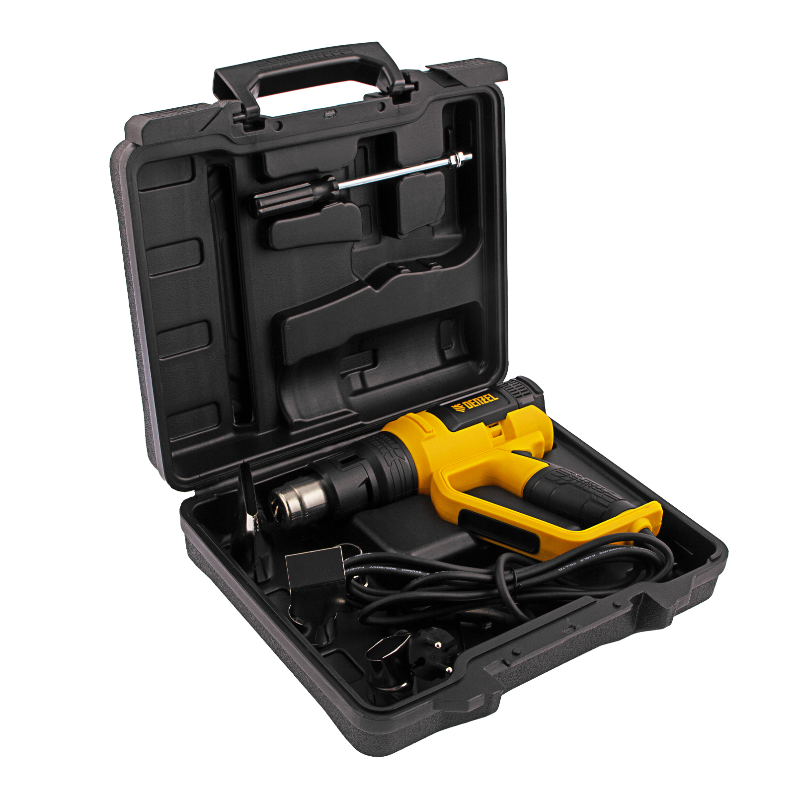 Профессиональный технический фен Denzel HG-2000E 28007 мощностью 2000 Вт, с 2 режимами и LCD дисплеем, предназначен для нагрева и сушки различных соединений и поверхностей. Применяется при снятии лакокрасочных покрытий, удалении старого линолеума и плитки, пайке металла и сварке пластика, разморозке труб, а также в процессе других задач в быту и на строительных объектах.,Высокая мощность двигателя 2 кВт обеспечивает производительность 250-500 л/мин. Максимальная рабочая температура составляет 650 ℃. Надежный и долговечный нагревательный элемент с керамическим каркасом устойчив к продолжительной эксплуатации.