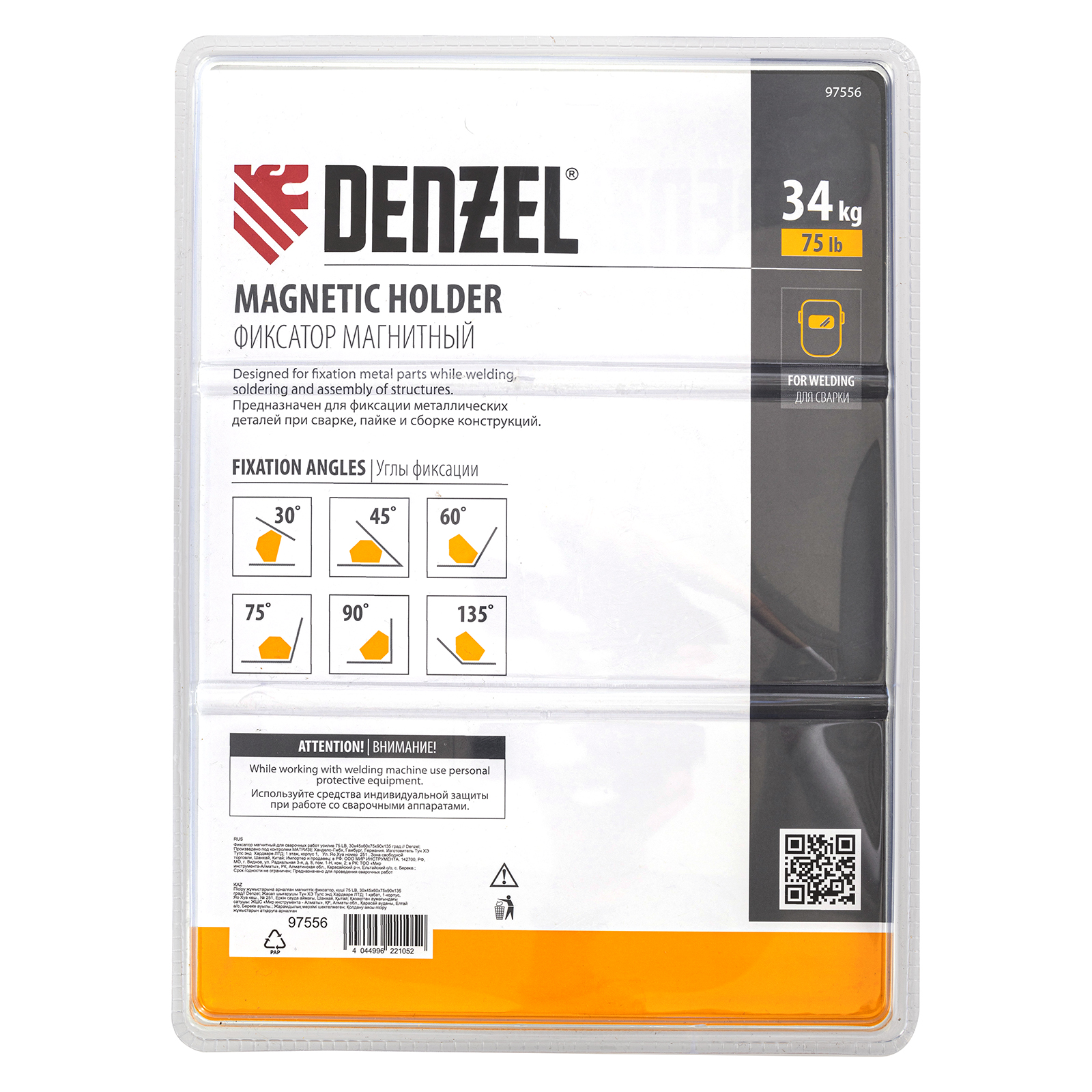 Фиксатор магнитный Denzel 97556 выдерживает усилие 75 LB (34 кг), позволяет соединять металлические детали разного размера под углом 30°, 45°, 60°, 75°, 90° и 135° и используется при проведении сварочных работ.