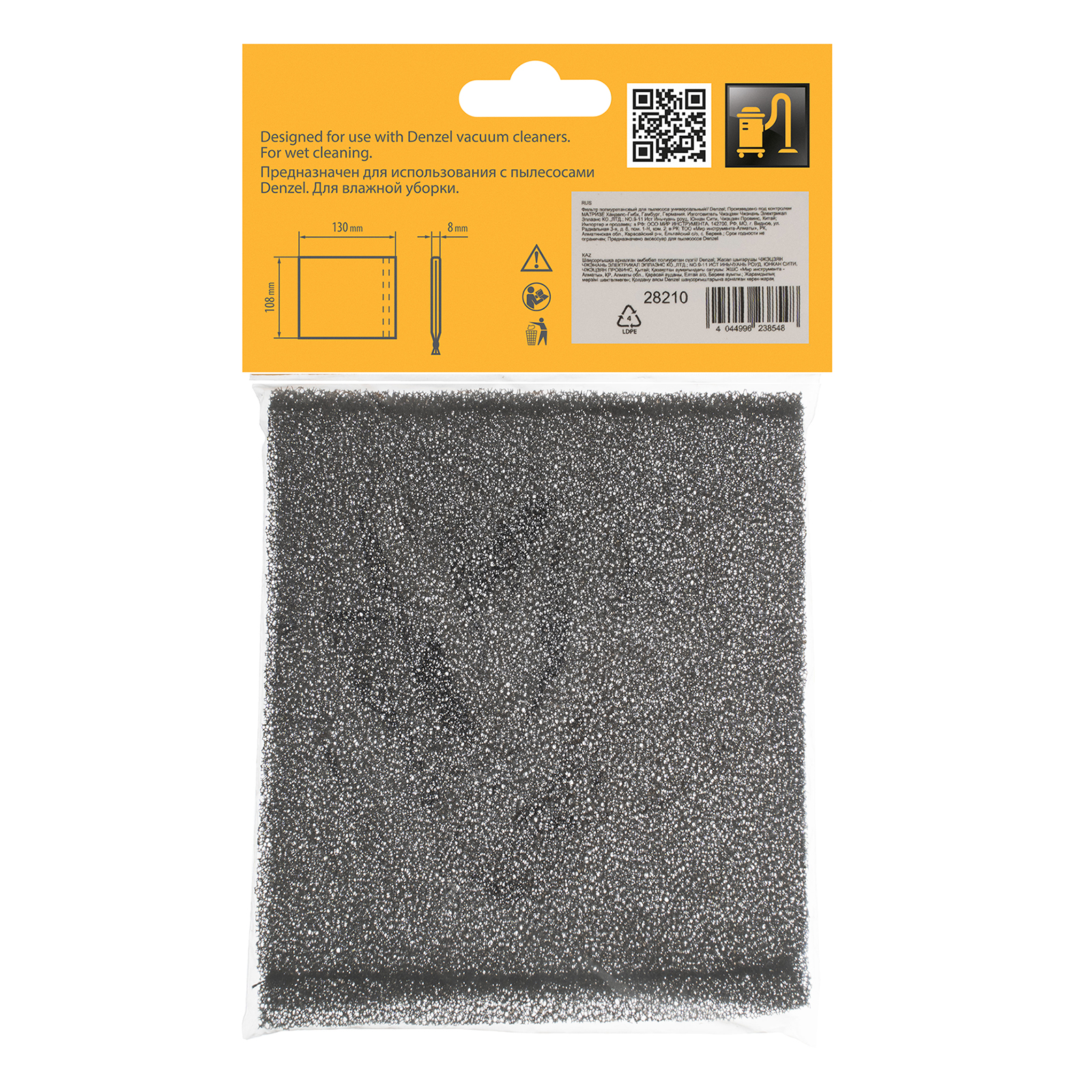 Универсальный полиуретановый фильтр Denzel 28210 предназначен для использования с пылесосом в режиме сбора воды. Совместим с моделями Denzel 28201, 28202, 28203, 28291, 28292, 28293.