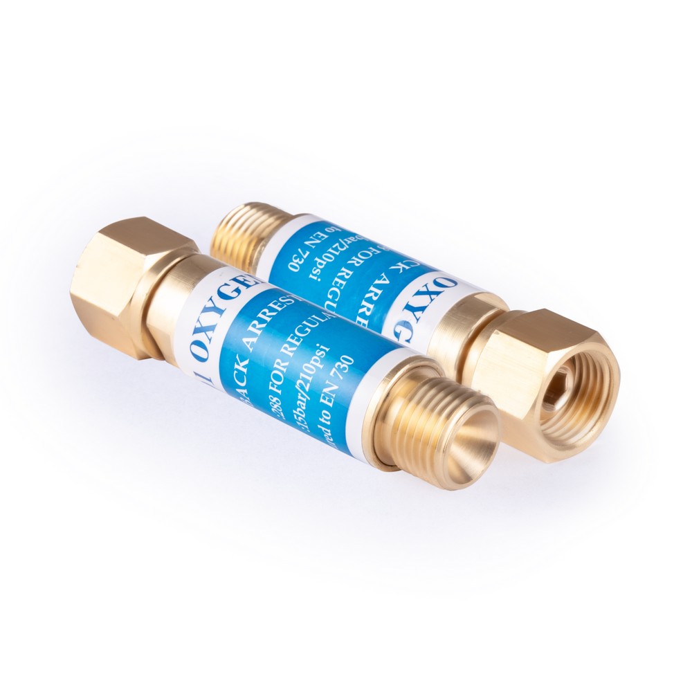 Клапан огнепреградительный предназначен для защиты от обратного потока газа, а также предотвращает разрыв резинотканевых рукавов и их возгорания в случае обратной волны давления, возникаемого в случае возгорания кислорода. Клапан устанавливается к соответствующему штуцеру на редуктор.