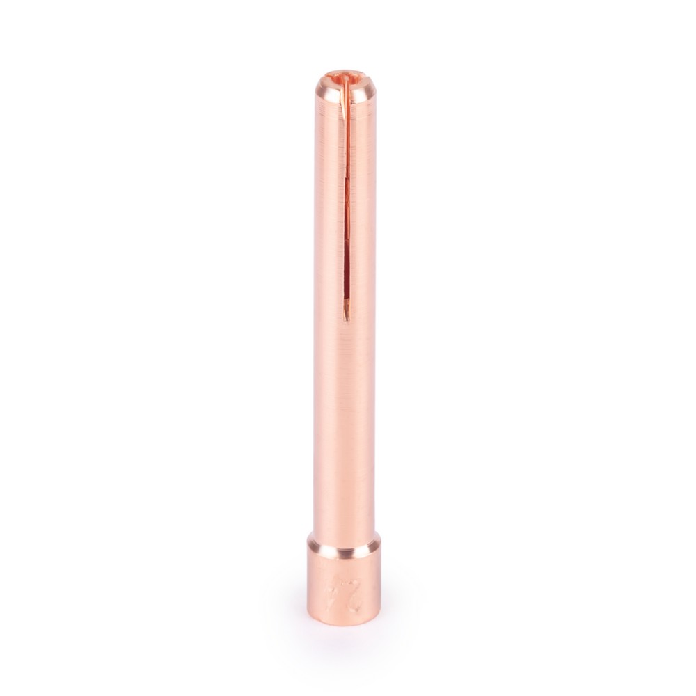 Корпус цанги изготавливается из медного сплава. Функционал данной детали сварочного аппарата – крепление, зажим и фиксация сварочного элемента: тугоплавкого электрода из вольфрамового сплава. Цанга 2,4 мм х 50 мм является сменной, изнашиваемой деталью.