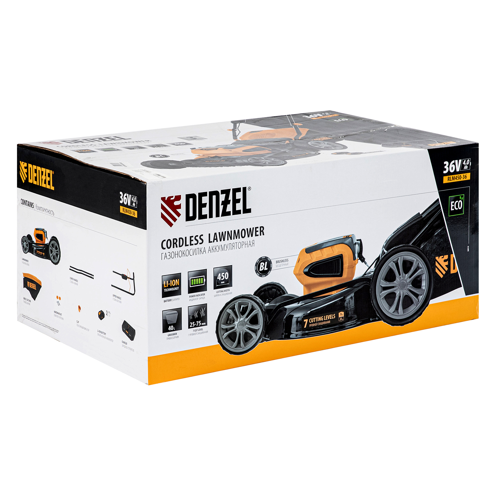 Бесщеточная аккумуляторная газонокосилка Denzel RLM450-36 58910 работает от двух батарей Li-Ion суммарным напряжением 36 В и емкостью 4 Ач, оснащена объемным травосборником на 40 л и обеспечивает ширину скашивания 450 мм за один проход. Машина предназначена для ухода за газоном и подрезания травы на небольших приусадебных участках. Высокоэффективный бесщеточный двигатель позволяет скашивать больше травы на одном заряде АКБ. 7-ступенчатая настройка высоты среза позволяет регулировать уровень скашивания травы в диапазоне 25-75 мм.,Аккумуляторная газонокосилка выгодно отличается от бензиновых и сетевых аналогов по уровню безопасности. Она не требует сложного техобслуживания, пользователю не нужно готовить топливную смесь, а управление будет комфортным даже для новичков.