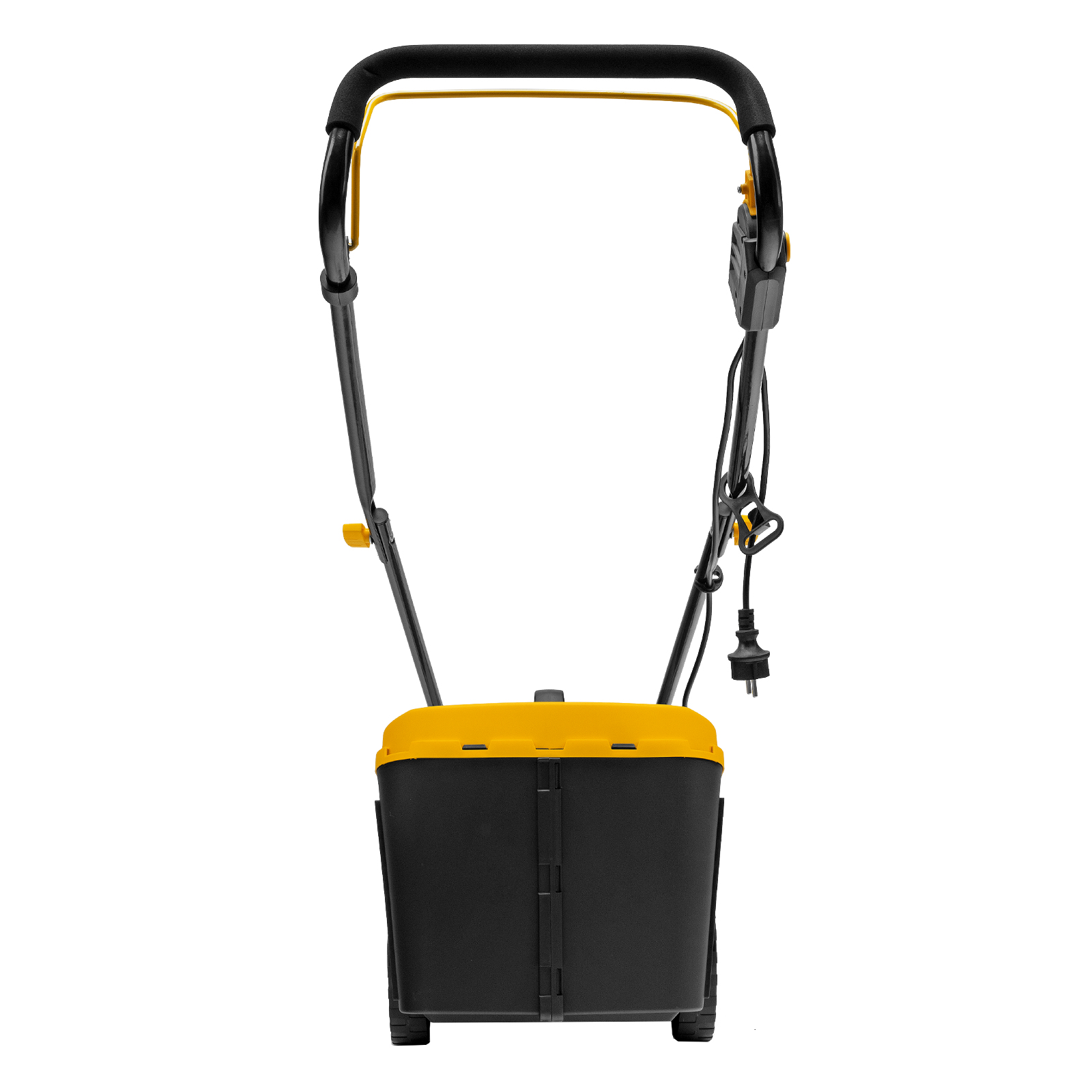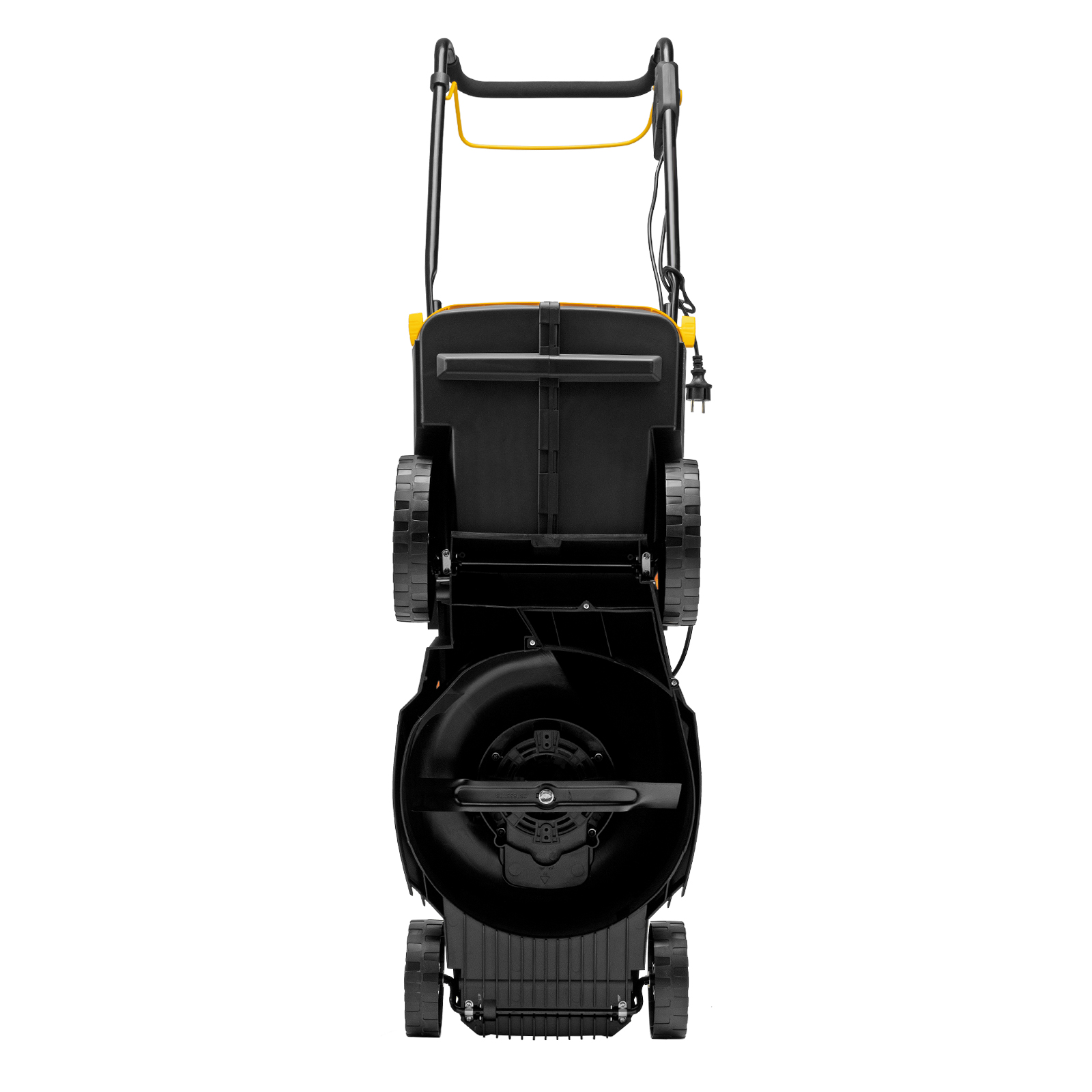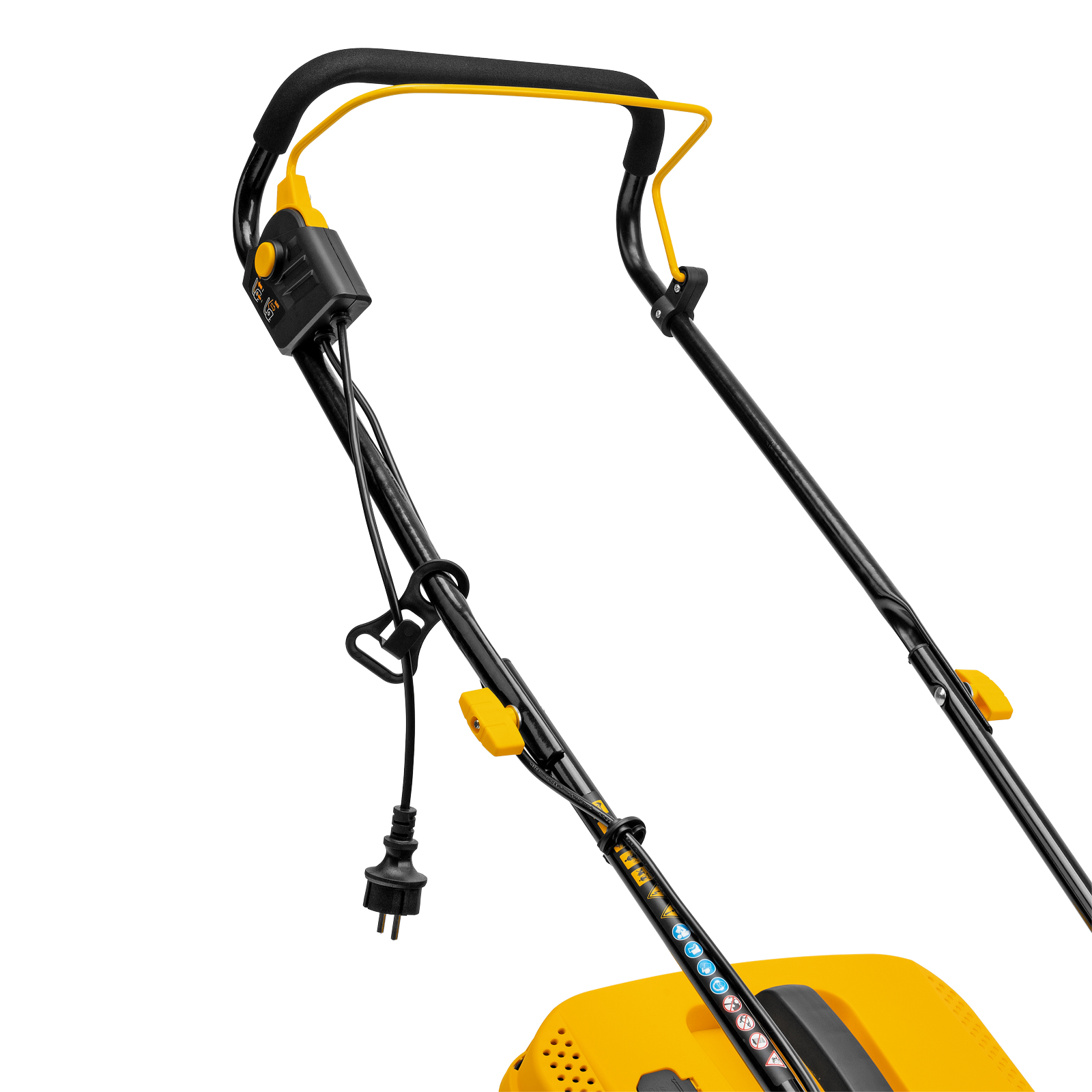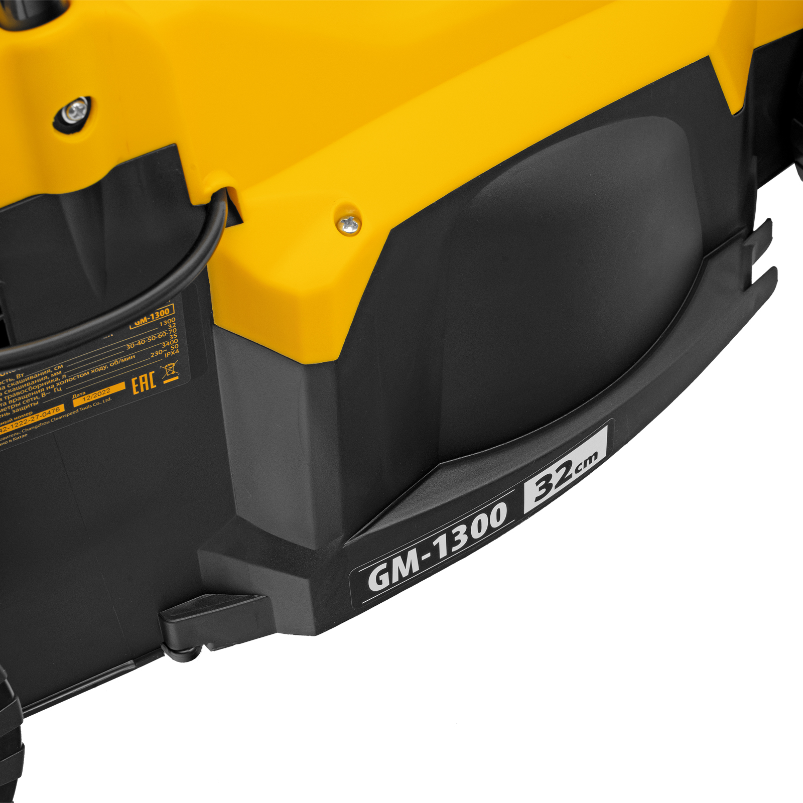 - Безопасность — функция блокировки исключает случайный запуск двигателя, а держатель кабеля предотвращает отключение техники от сети и уменьшает риск попадания провода под нож.