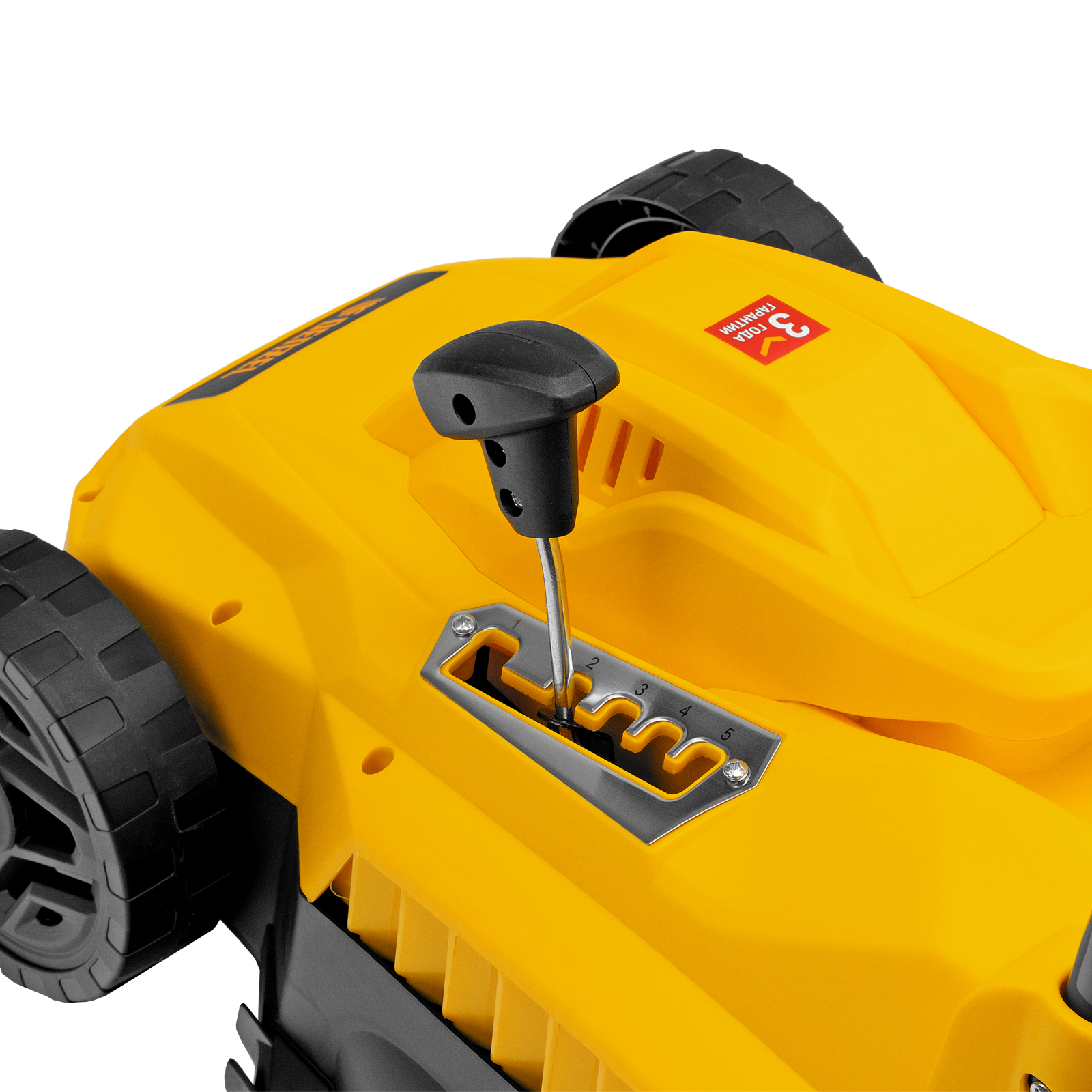 - Простая регулировка высоты скашивания — достаточно установить рычаг в нужное положение, что удобно сделать даже одной рукой.