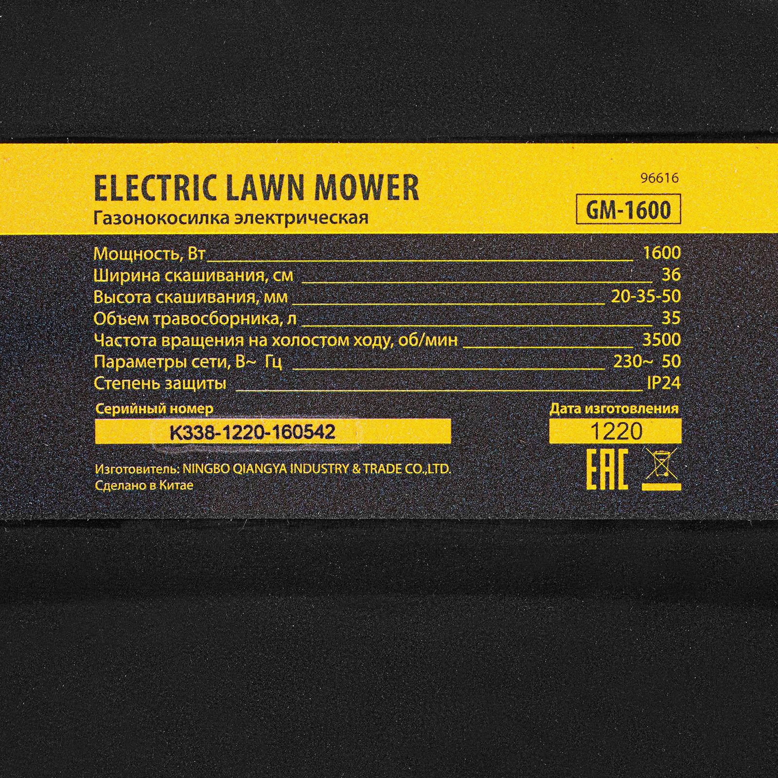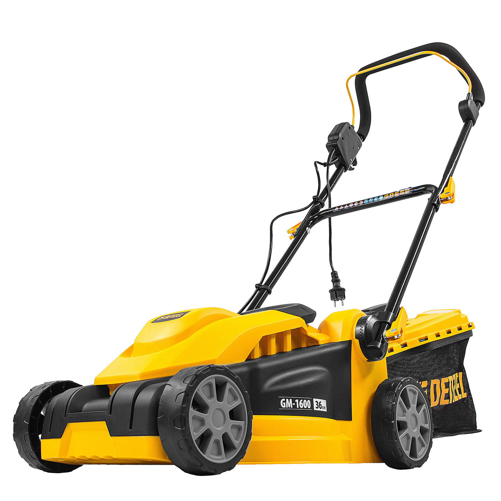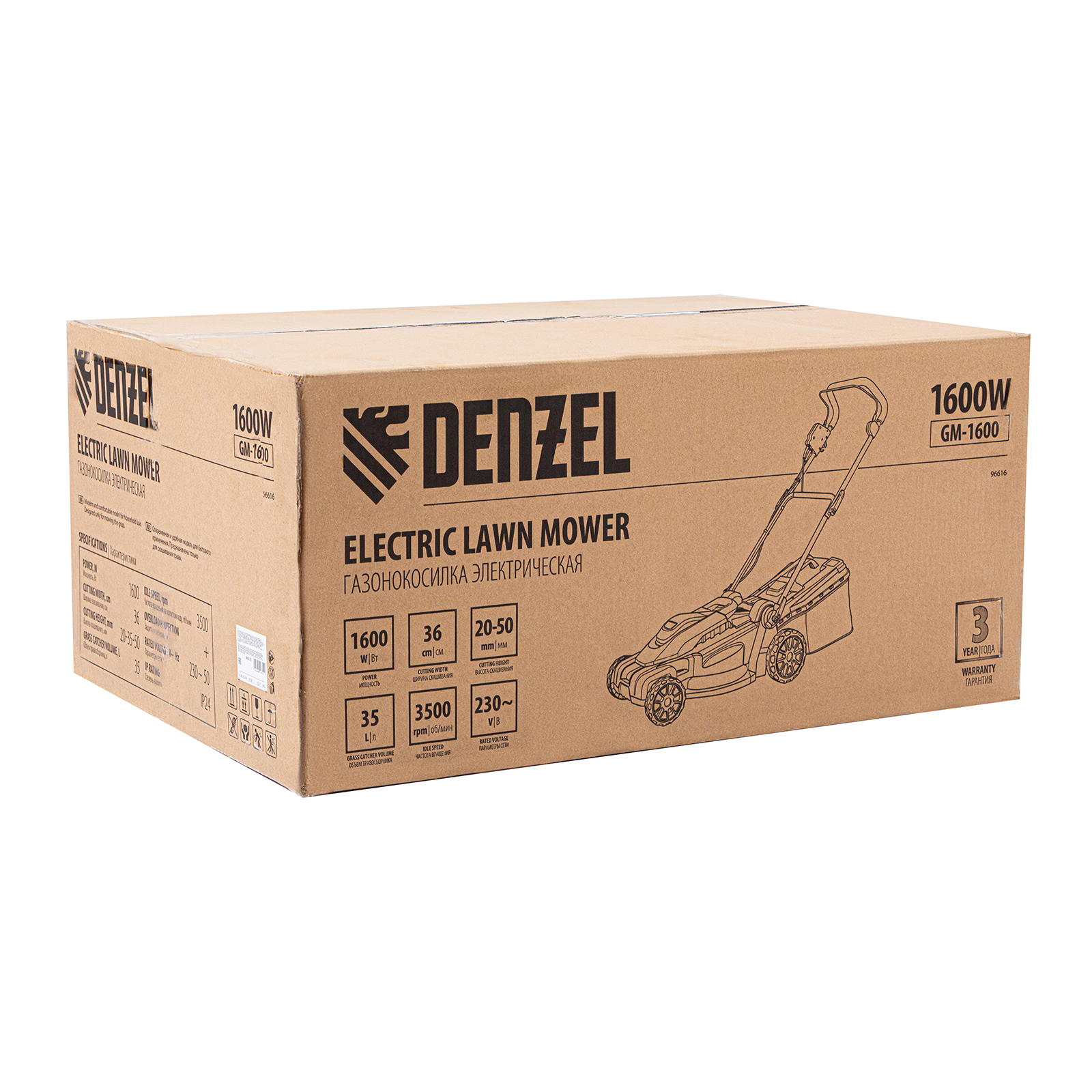 Газонокосилка электрическая GM-1600, 1600 Вт, ширина 36 см, 3 уровя, травосборник 35 л. Denzel в Челябинске