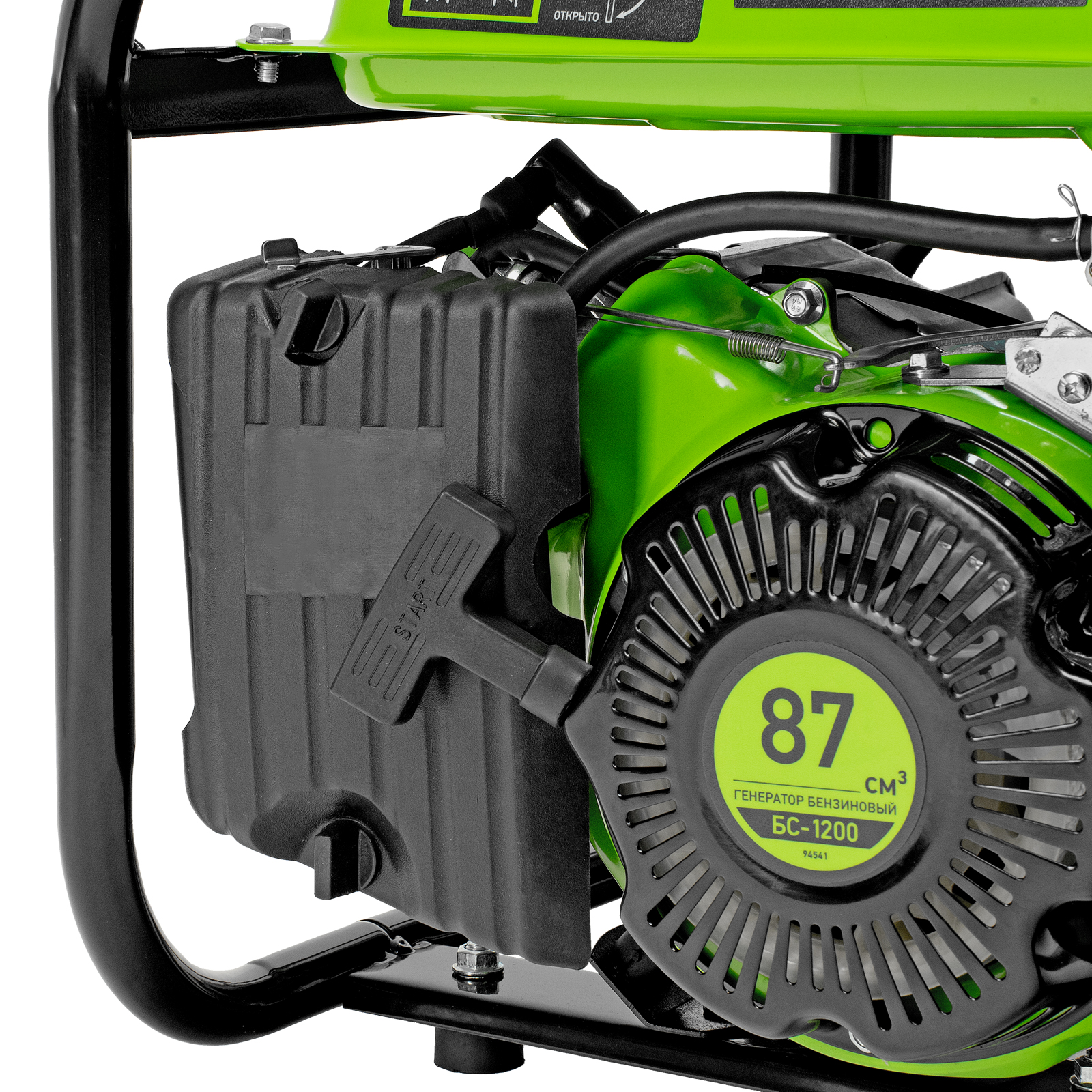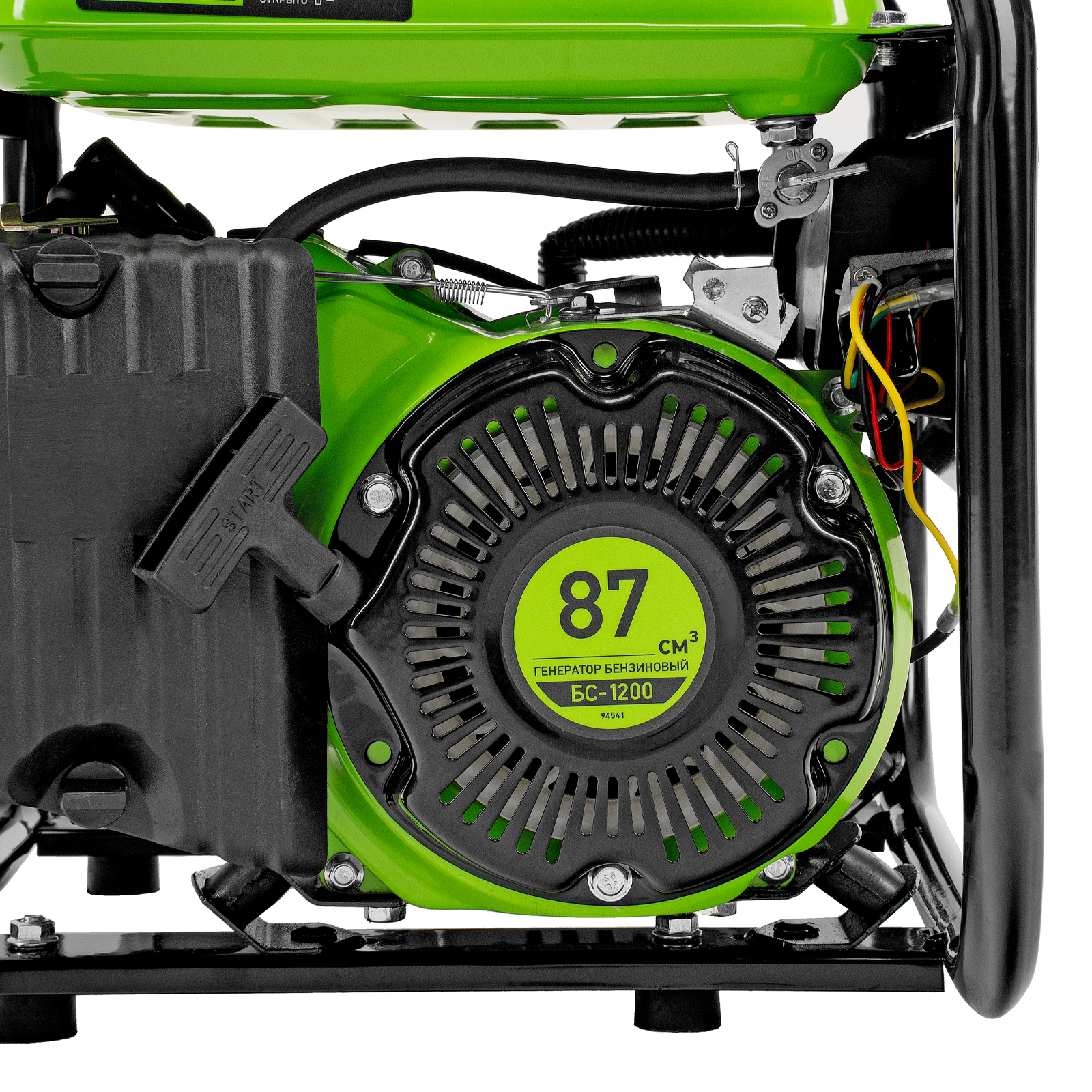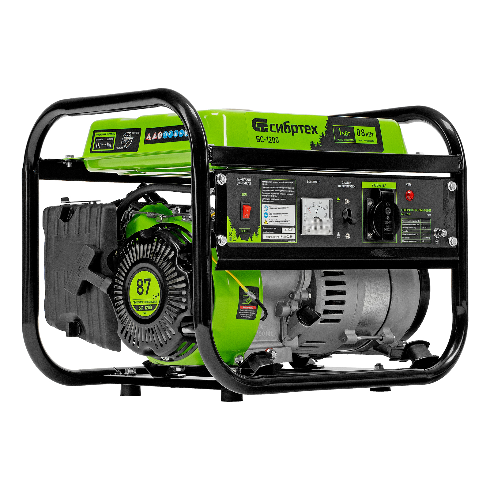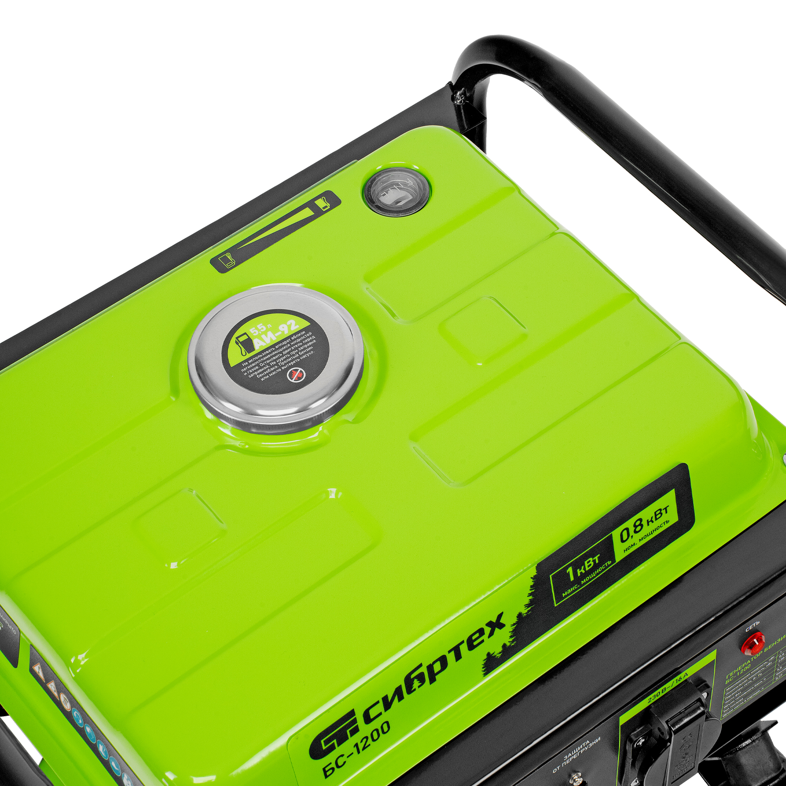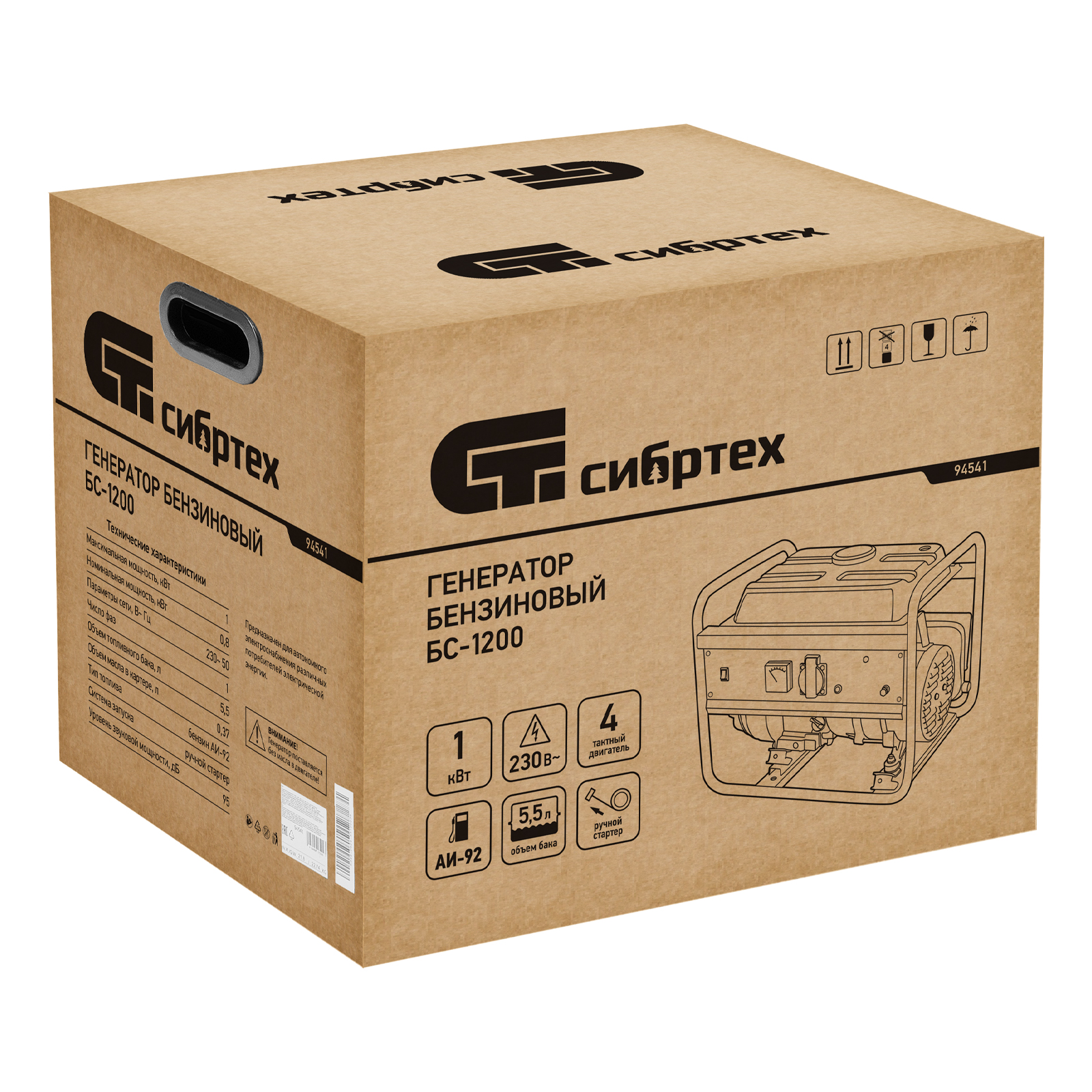 Бензиновый генератор Сибртех БС-1200 94541 на 230 В, максимальной мощностью 1 кВт, с 4-тактным двигателем, с баком на 5,5 л и ручным стартером, может использоваться в качестве простой резервной системы электроснабжения на природе, в мастерской или на даче. Вырабатываемой мощности в 800 Вт хватит для одновременного обеспечения электричеством 4 ламп накаливания, компьютера и роутера. Также возможно подключение одного инструмента с высоким пусковым током (не превышающим 1000 Вт), такого как дрель, перфоратор, углошлифовальная машина.