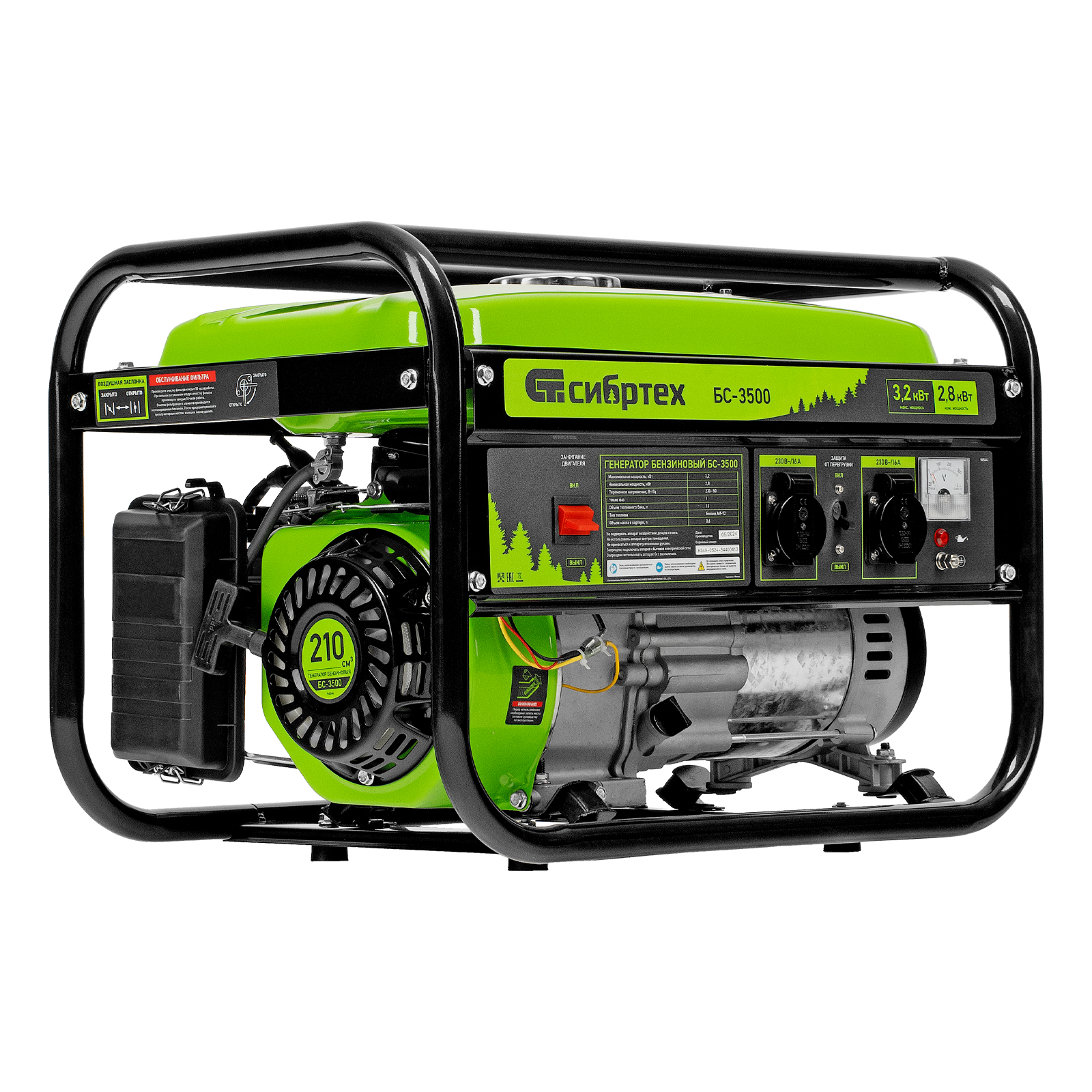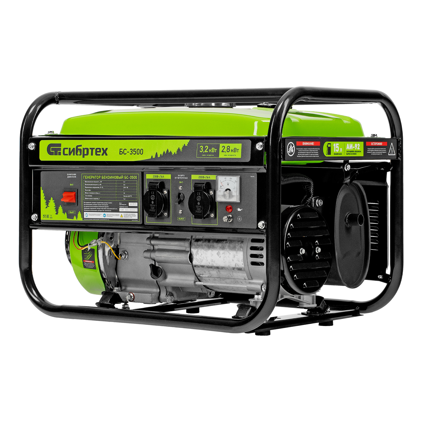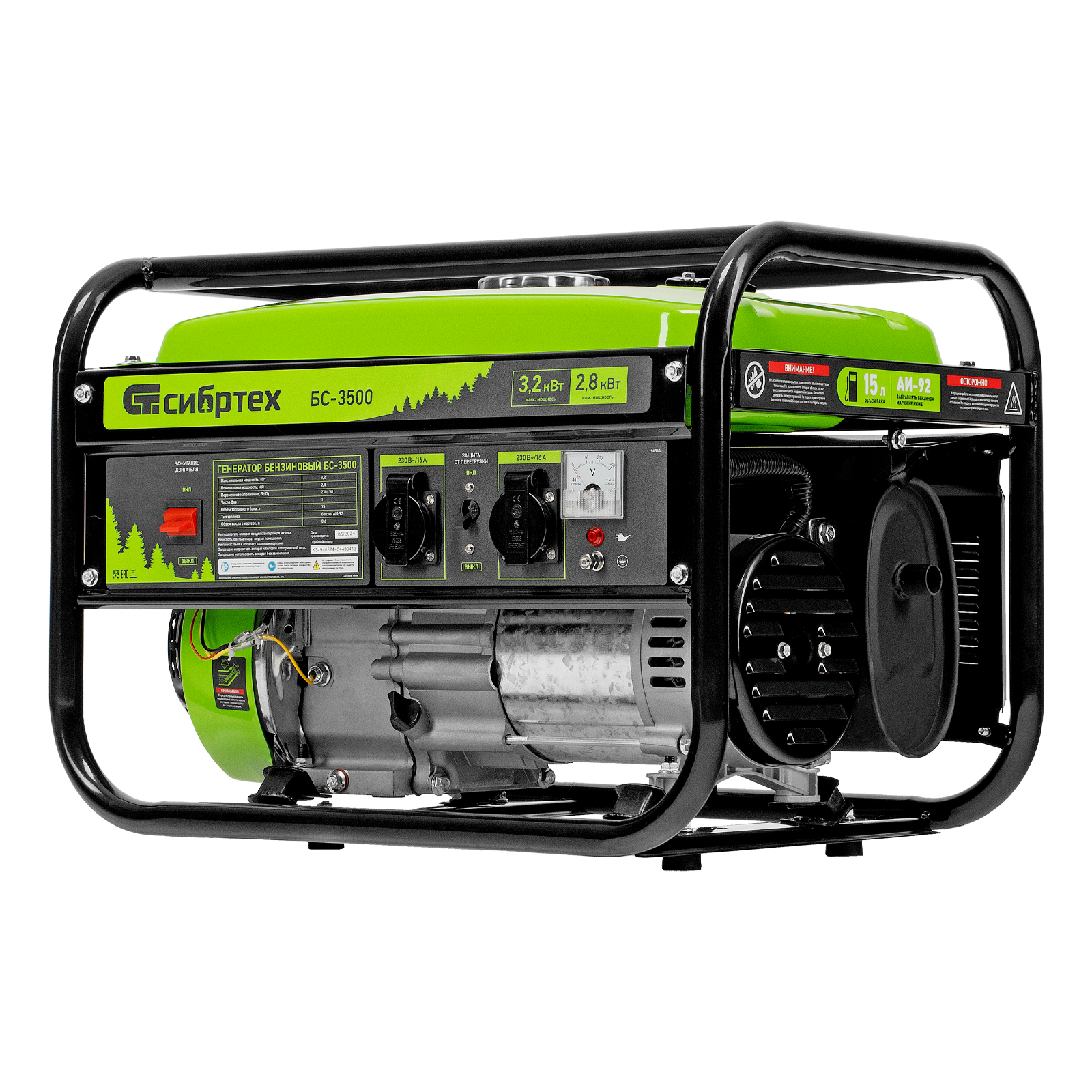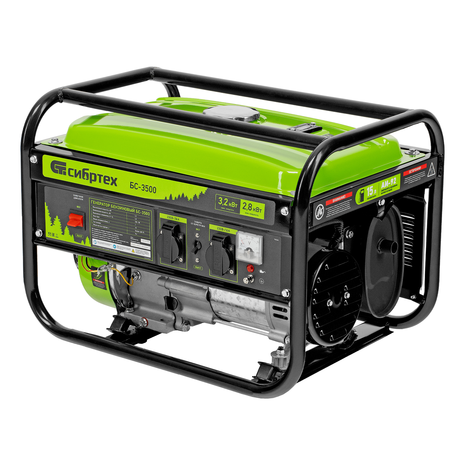 Бензиновый генератор Сибртех БС-3500 94544 на 230 В, максимальной мощностью 3,2 кВт, с 4-тактным двигателем, 15-литровым баком и ручным стартером, предназначен для электроснабжения дачи, кемпинга, небольшого магазина, гаража или строительной площадки. Весит всего 38,8 кг, что облегчает транспортировку, а значит, его можно брать на выездные работы или на природу. Выдаваемого напряжения 3,2 кВт хватает для одновременного подключения 4 ламп накаливания, холодильника, телевизора, электрочайника.