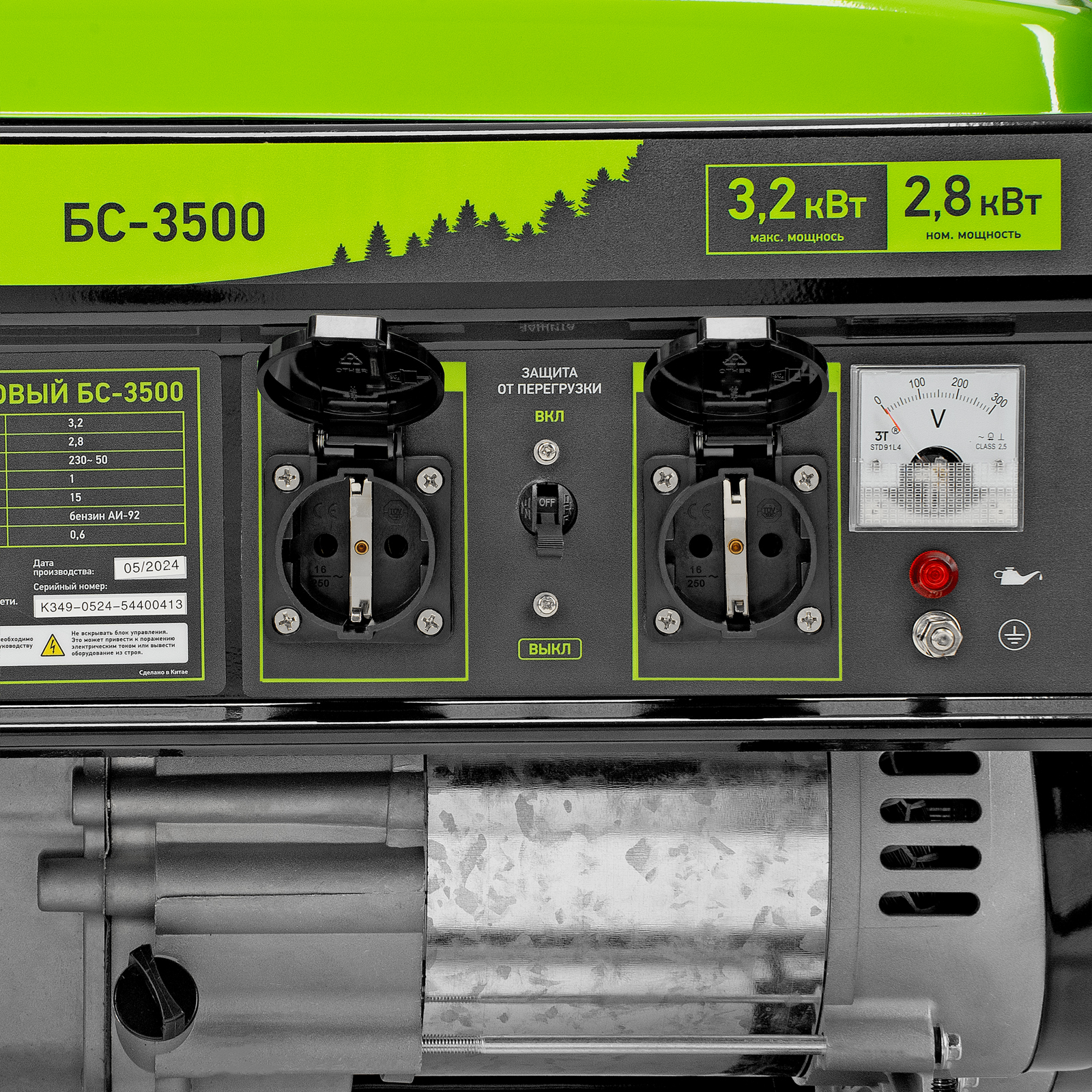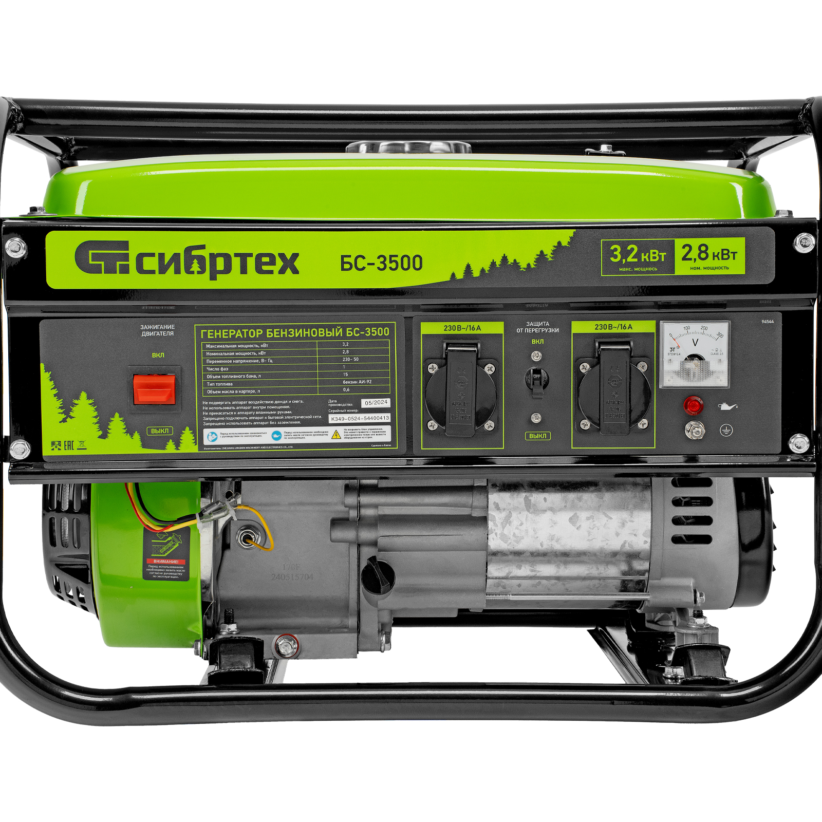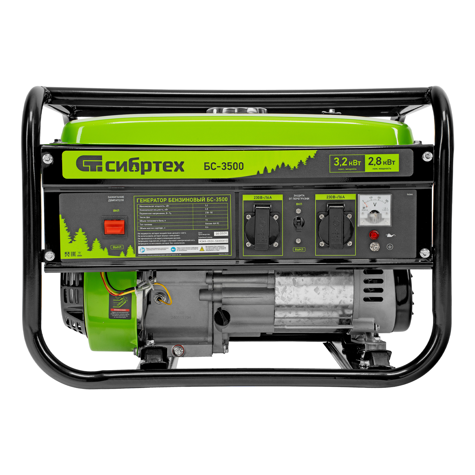 Бензиновый генератор Сибртех БС-3500 94544 на 230 В, максимальной мощностью 3,2 кВт, с 4-тактным двигателем, 15-литровым баком и ручным стартером, предназначен для электроснабжения дачи, кемпинга, небольшого магазина, гаража или строительной площадки. Весит всего 38,8 кг, что облегчает транспортировку, а значит, его можно брать на выездные работы или на природу. Выдаваемого напряжения 3,2 кВт хватает для одновременного подключения 4 ламп накаливания, холодильника, телевизора, электрочайника.