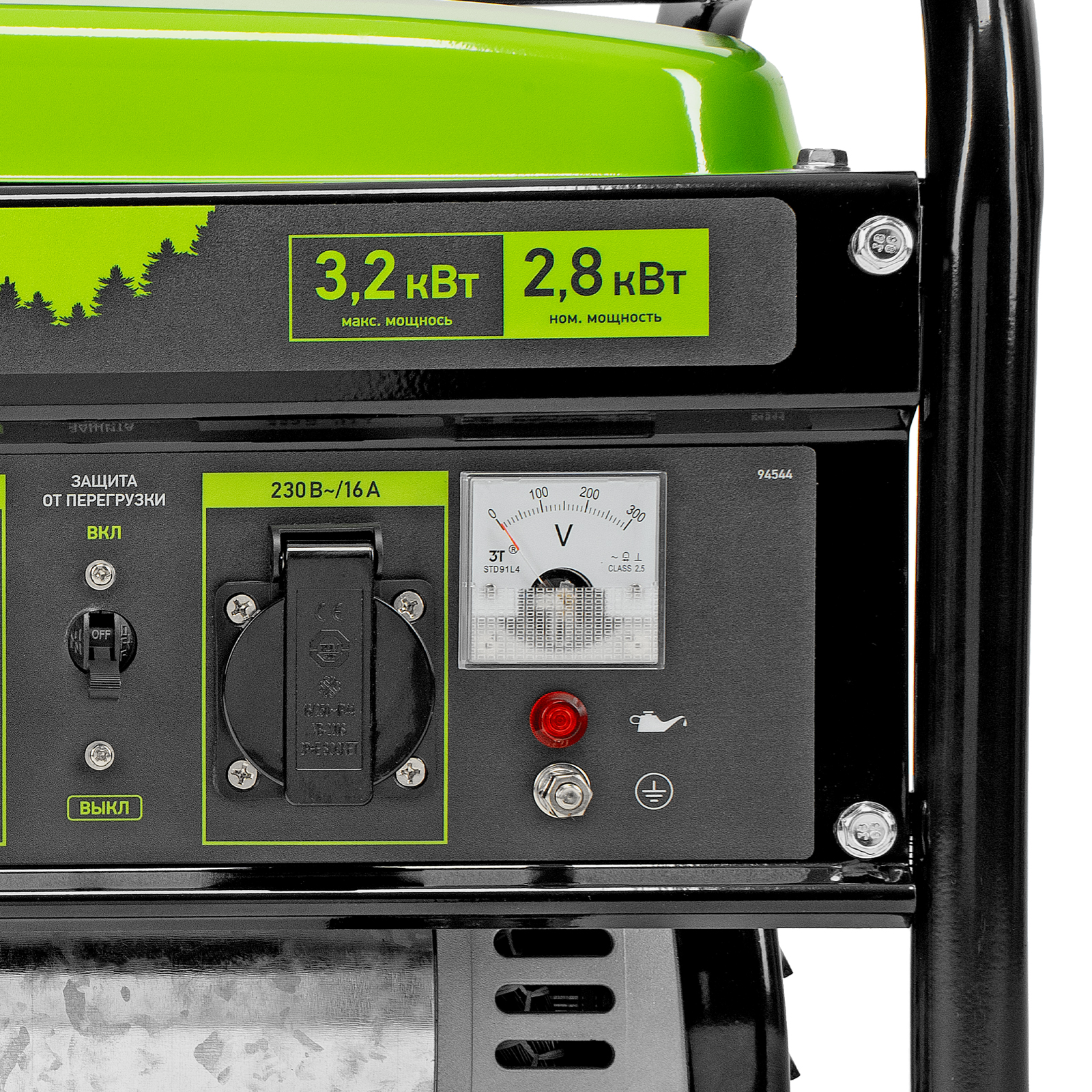 - Контроль рабочих параметров — встроенный вольтметр позволяет отслеживать напряжение в сети, а топливный индикатор — уровень бензина в баке.