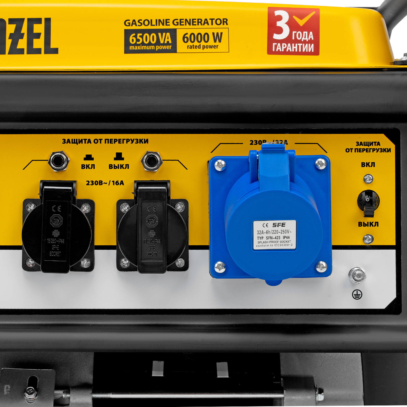 Генератор Denzel GE 7900 94638, 220 В / 50 Гц, мощностью 6,5 кВт, с ручным стартом и объемом бака 25 л, выдерживает большие нагрузки и подходит для питания мощного оборудования на даче, строительной площадке, в торговой точке. Генератор оснащен 3 розетками, одна из которых силовая, что позволяет подключать промышленное оборудование. Полного бака хватает на 8,5 ч работы без дозаправки.