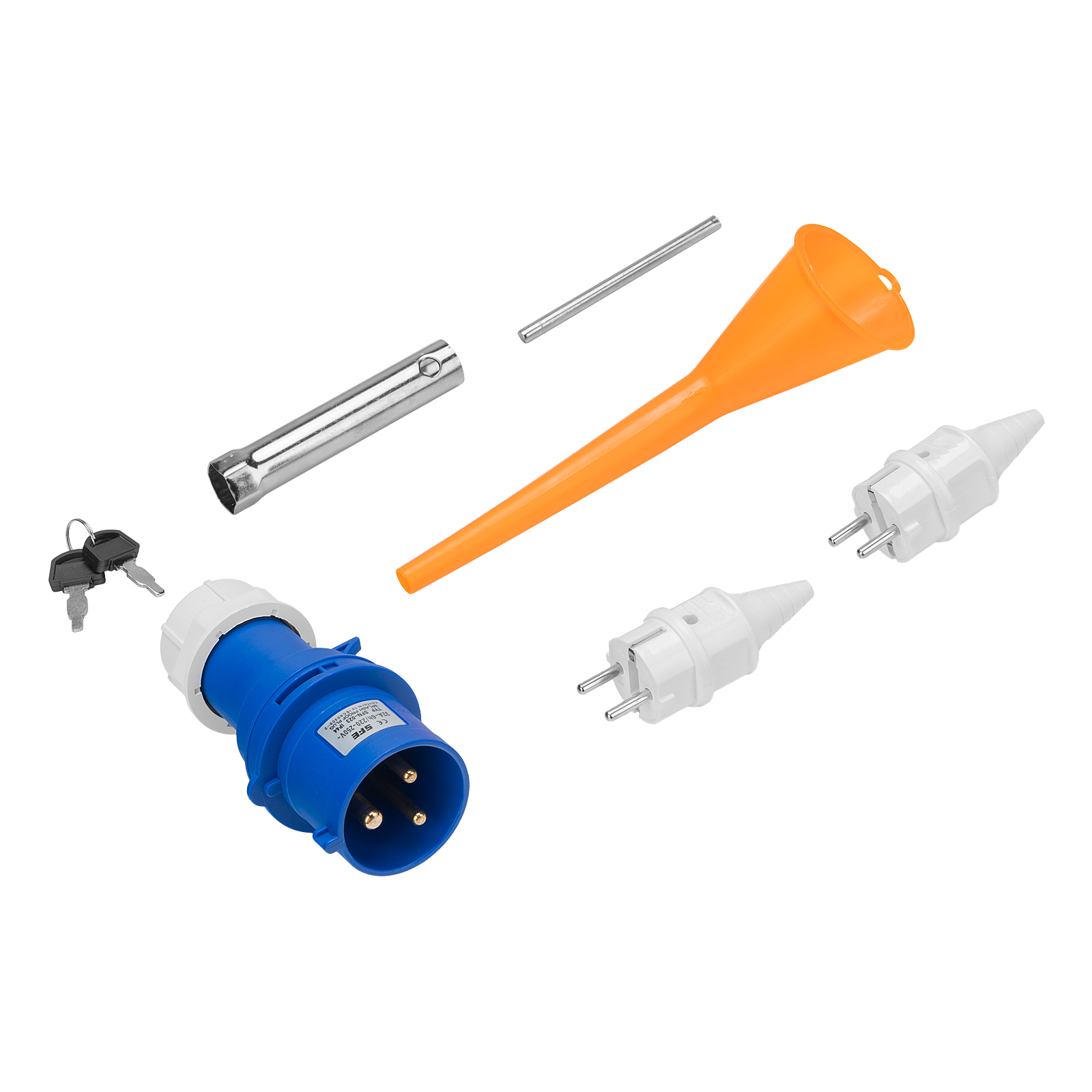 Генератор - 1 штКлюч свечной - 1 штКлюч зажигания - 2 штВилка 230В/16А - 2 штВилка 230В/32А - 1 штРуководство по эксплуатации с гарантийным талоном - 1 штБатарея аккумуляторная - 1 шт |