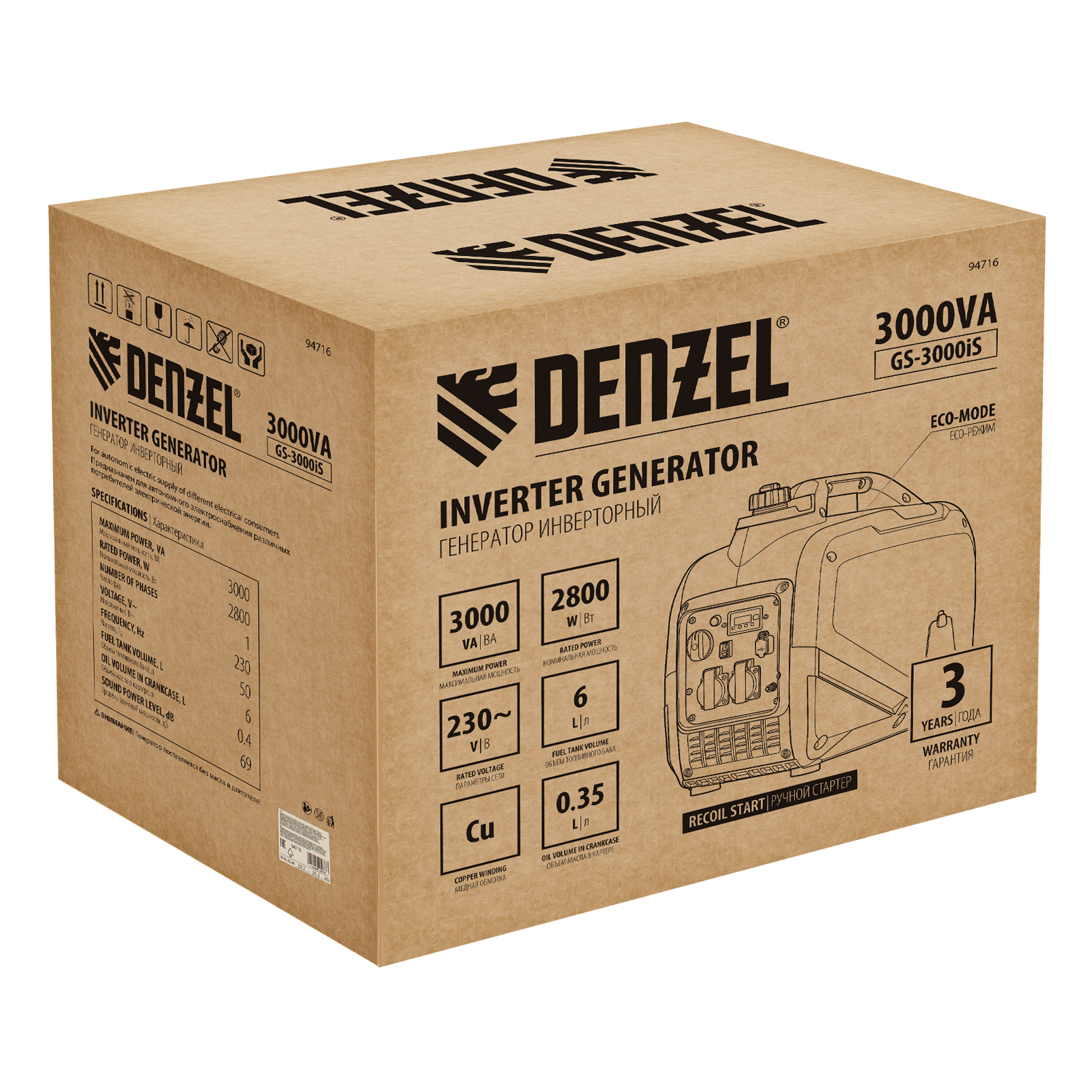 Генератор инверторный GS-3000iS, 3,0 кВт, 230 В, закрытый корпус, ручной старт DENZEL в Челябинске