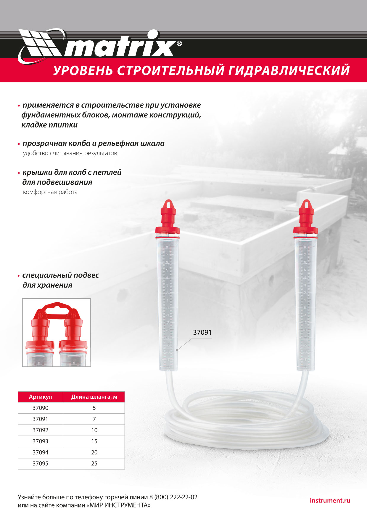 Гидроуровень Matrix 37092 с удлиненными колбами и рельефной градуировкой предназначен для выравнивания объектов на расстоянии до 10 м. Используется при проведении ремонтно-строительных работ: изготовлении опалубки, установке фундамента, кладке плитки. Особо светлые колбы с рельефной градуировкой облегчают считывание результатов измерения.