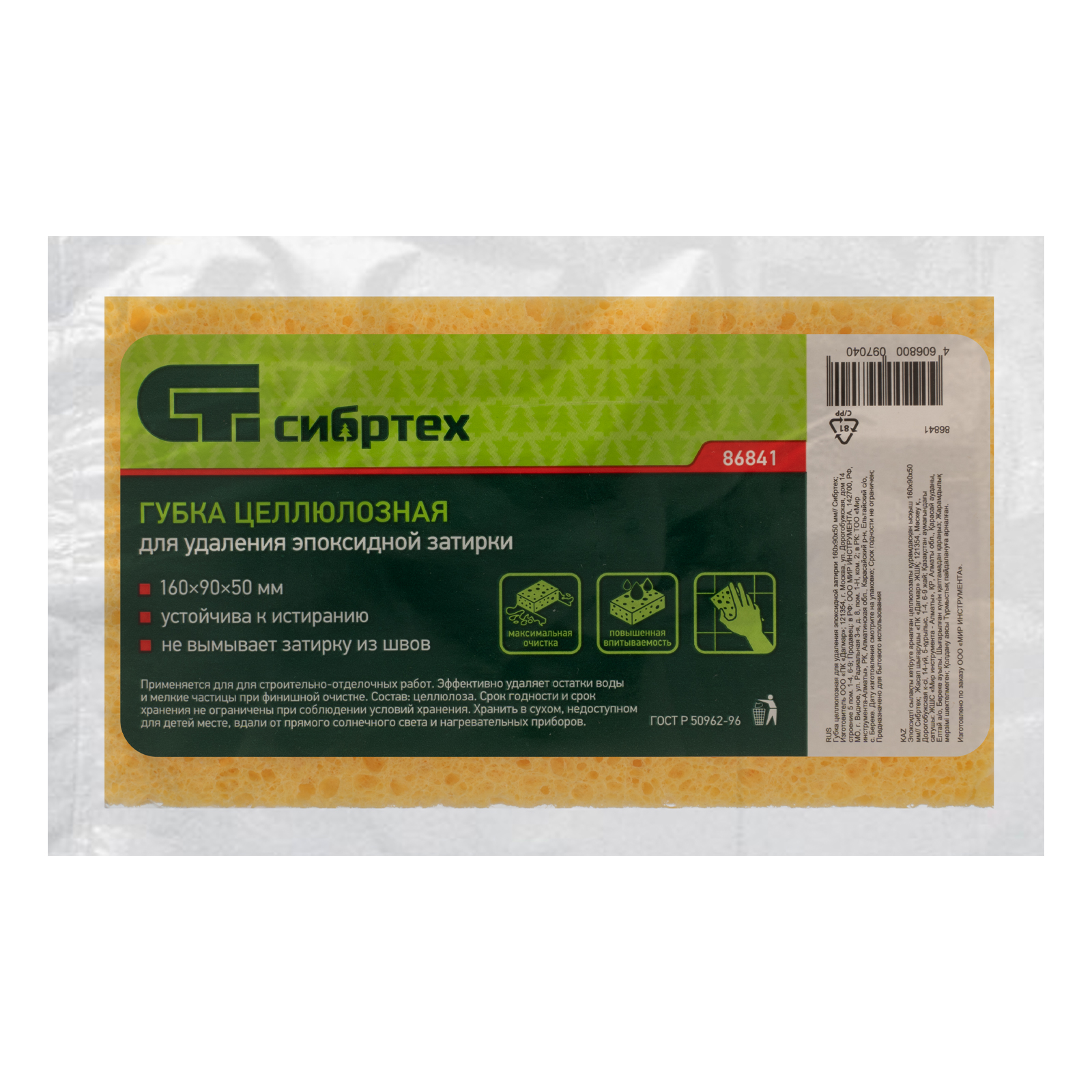 Целлюлозная губка Сибртех 86841 размером 160 x 90 x 50 мм применяется для удаления излишков эпоксидной затирки. Эффективна для финишной очистки поверхности от мелких частиц раствора и остатков воды.