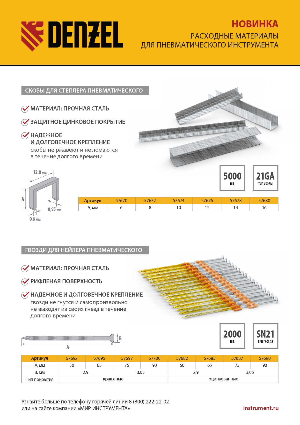 Оцинкованные гвозди Denzel 57685 типа SN21, длиной 65 мм и диаметром 2,9 мм, 2000 шт. в упаковке, — расходники для пневматического нейлера. Используются для скрепления различных материалов, будут полезны во время сборочных и отделочных работ.