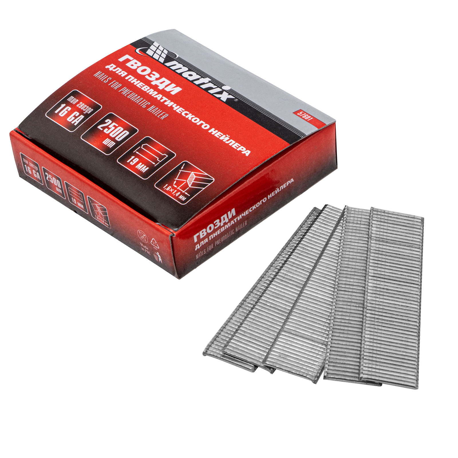 Гвозди для пневматического нейлера 16GA, сечение 1.6 х 1.4, длина 19 мм, 2500 шт Matrix в Челябинске