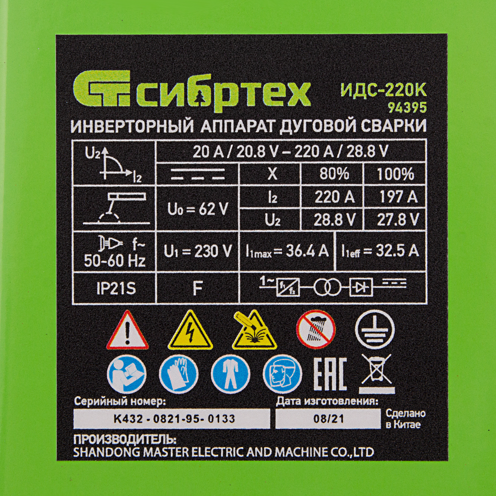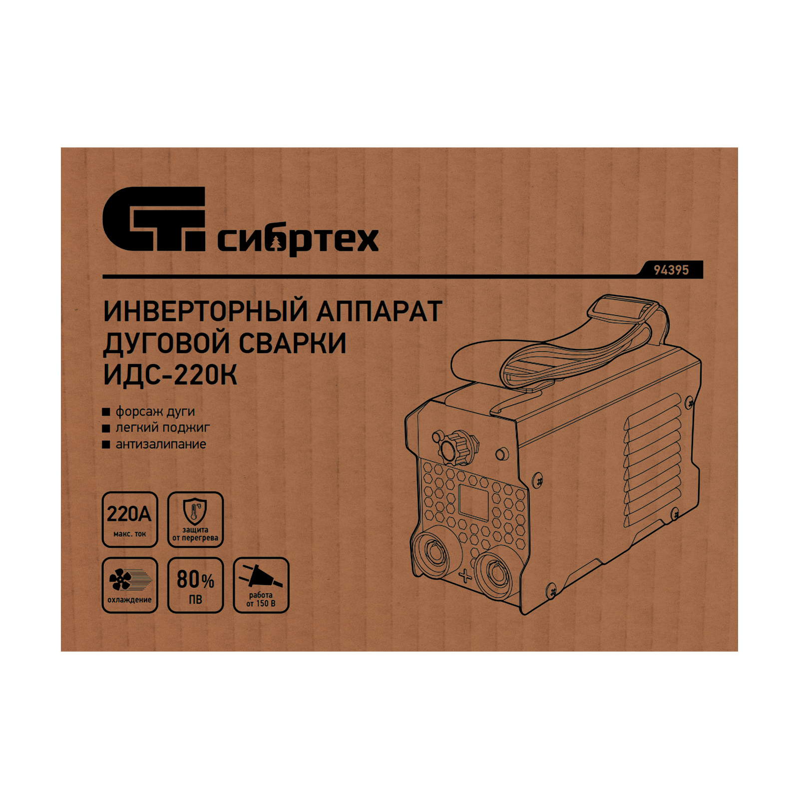 Инверторный аппарат дуговой сварки ИДС-220K, 220 А, ПВ 80%, диаметр электрода 1,6-5 мм Сибртех в Челябинске