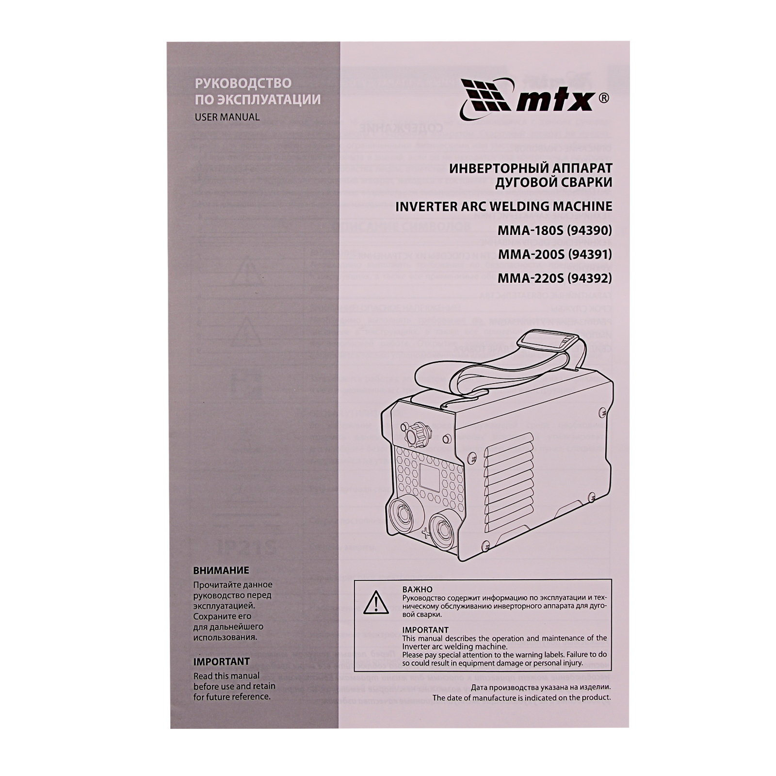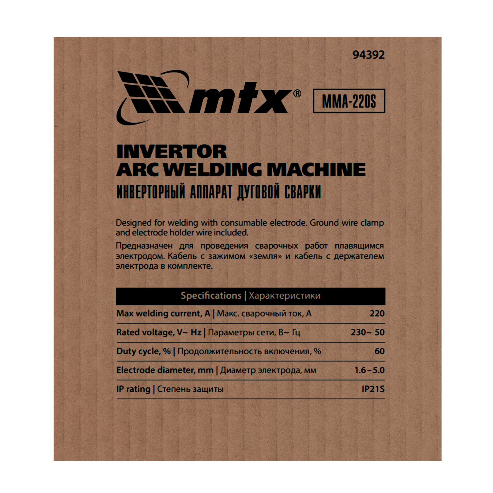 Инверторный аппарат дуговой сварки MMA-220S, 220 А, ПВ60%, диаметр электрода 1,6-5 мм MTX в Челябинске