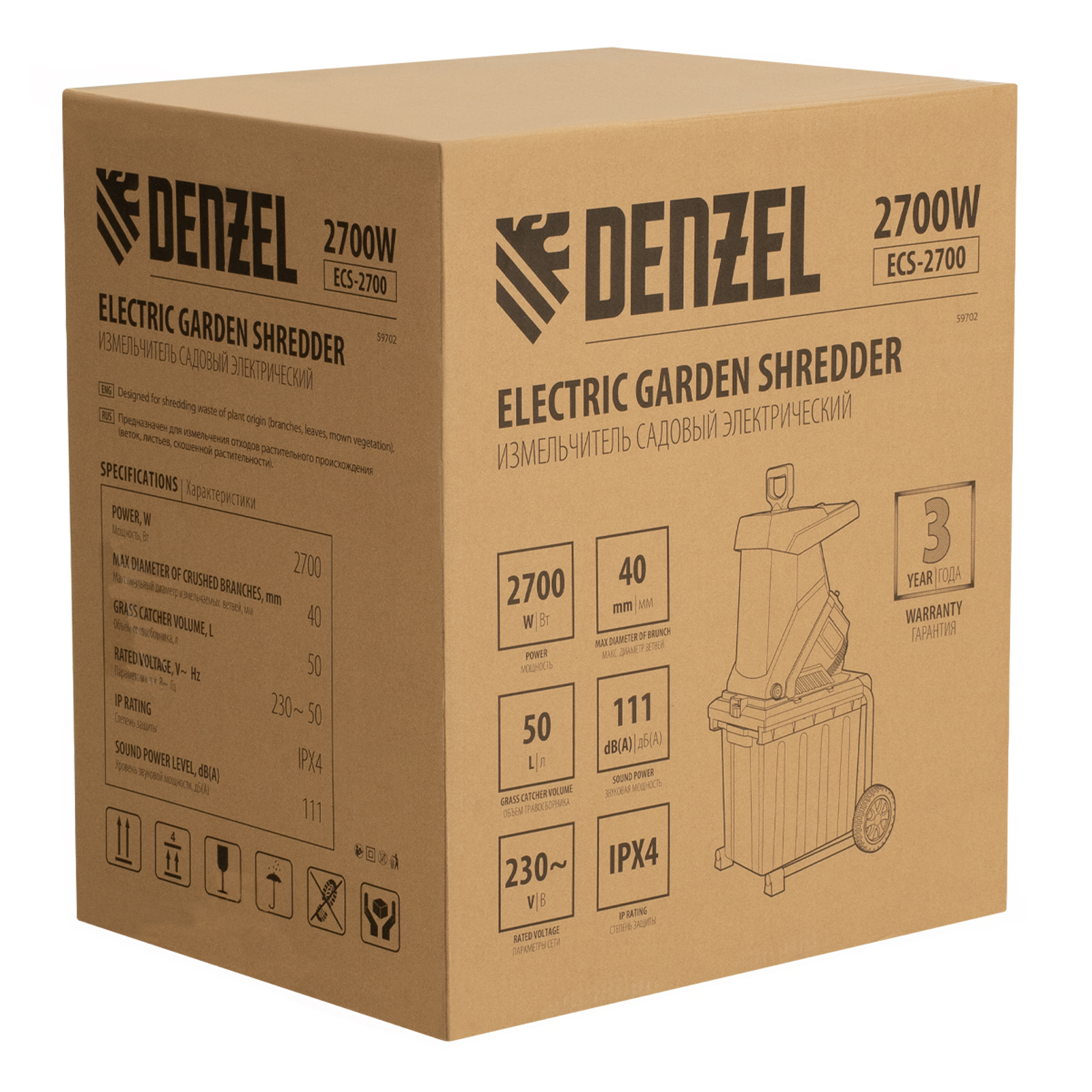 Измельчитель садовый электрический Denzel ECS-2700 59702 мощностью 2700 Вт предназначен для утилизации веток, листвы, скошенной растительности диаметром до 40 мм. Станет незаменимым помощником в саду или на даче, позволит поддерживать порядок на приусадебном участке. Скорость вращения режущих элементов составляет 4050 оборотов в минуту, что позволяет быстро решать поставленные задачи. Пластиковый травосборник объемом 50 л легко снимается для опорожнения.