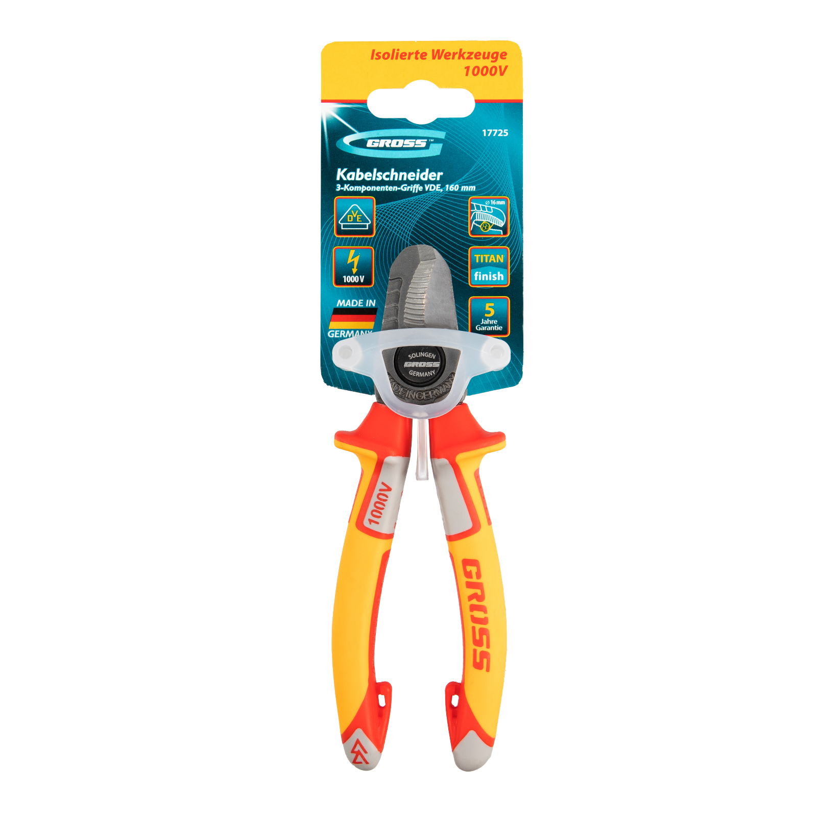 Кабелерез Gross 17725 длиной 160 мм, с трехкомпонентными диэлектрическими рукоятками до 1000 В, широко используется при проведении слесарных и электромонтажных работ. С его помощью можно перерезать многопроволочную жилу из меди и алюминия, снять изоляцию с электропроводов. Инструмент не подходит для работы с алюминиевыми сплавами, стальной проволокой и холоднотянутыми медными проводами, может использоваться только для многопроволочных жил (общий диаметр кабеля не более 16 мм, сечение до 50 кв. мм). Важно — техника безопасности не допускает выполнения работ под напряжением.