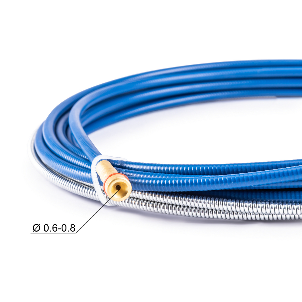 Направляющий канал производства Foxweld для подачи сварочной проволоки от источника питания MIG/MAG до сопла горелки изготовлен из стали и покрыт пластиком синего цвета.
