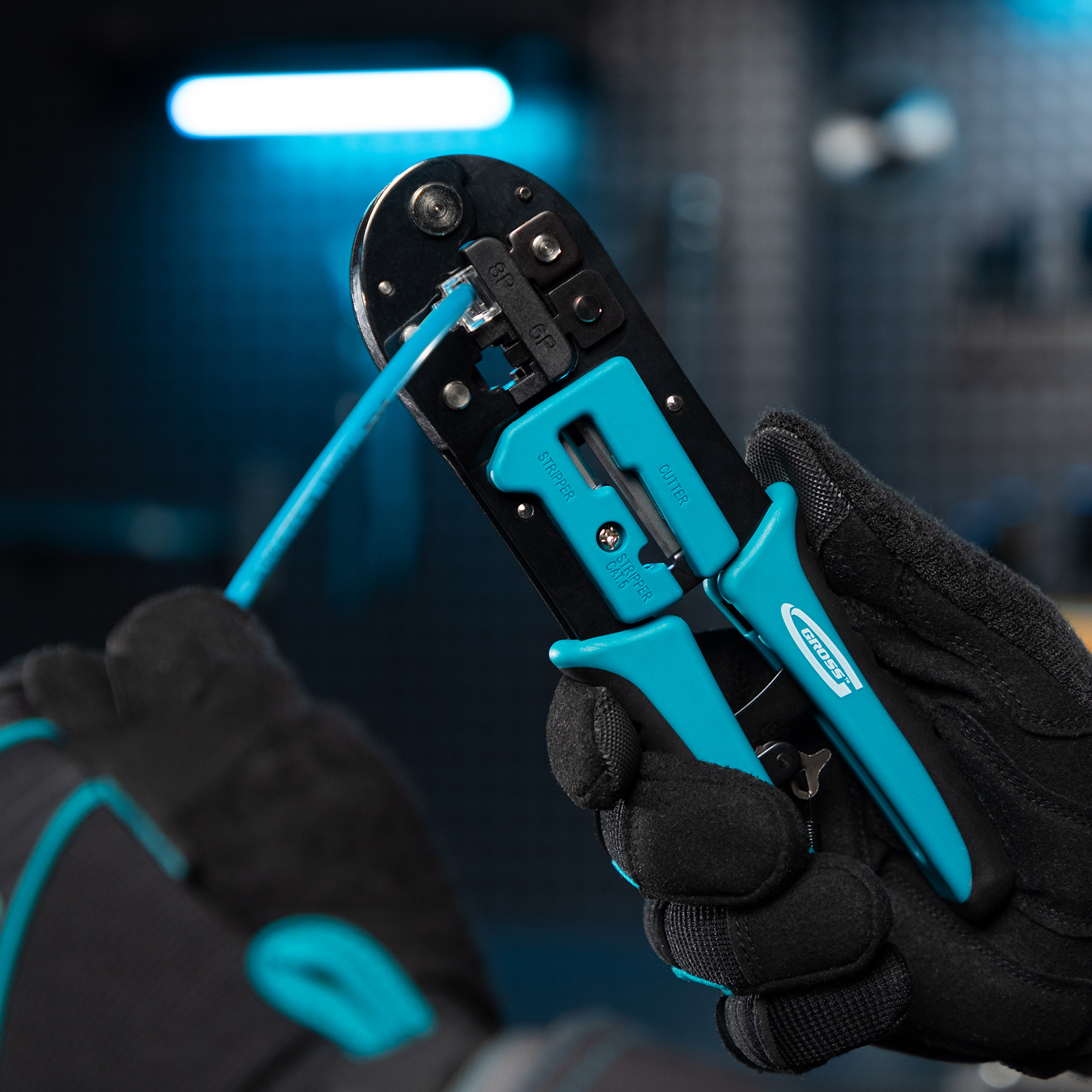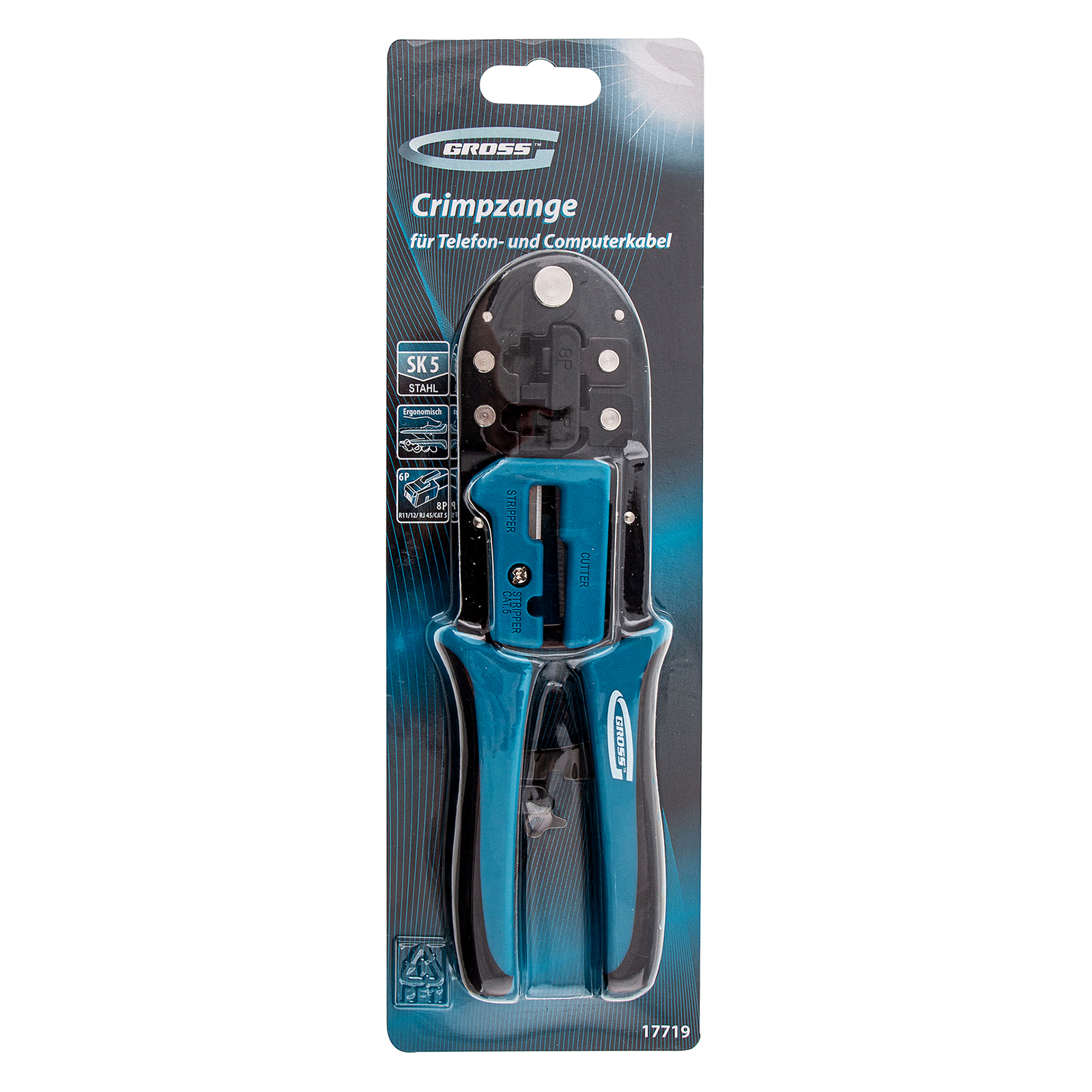 Клещи Gross 17719 предназначены для обжима телефонных и компьютерных клемм наиболее популярных типоразмеров RJ45, 8P и RJ11/12, 6P. Пригодятся частным мастерам и профессионалам для подключения компьютеров и телефонов к сети.