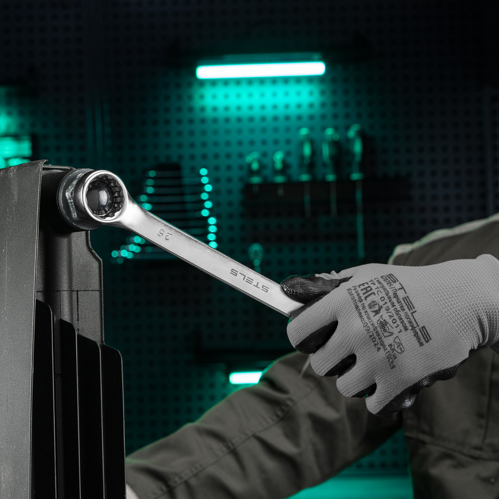 Комбинированный ключ Stels 15227 из стали CrV, 25 мм, покрытый матовым хромом, используется для закручивания и откручивания гаечных и болтовых соединений. Накидная головка имеет 12-гранную внутреннюю поверхность, что облегчает работу с крепежом и уменьшает опасность его повреждения. Ключ применяется в слесарных мастерских и автосервисах, а также будет полезен для решения бытовых задач.